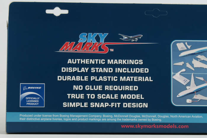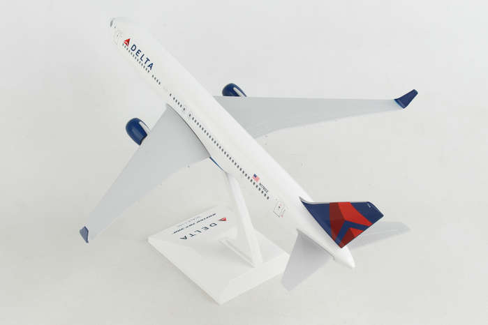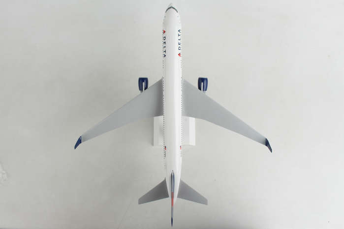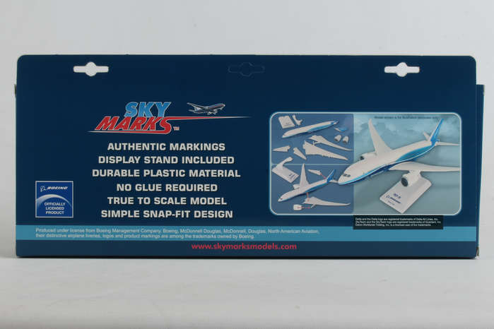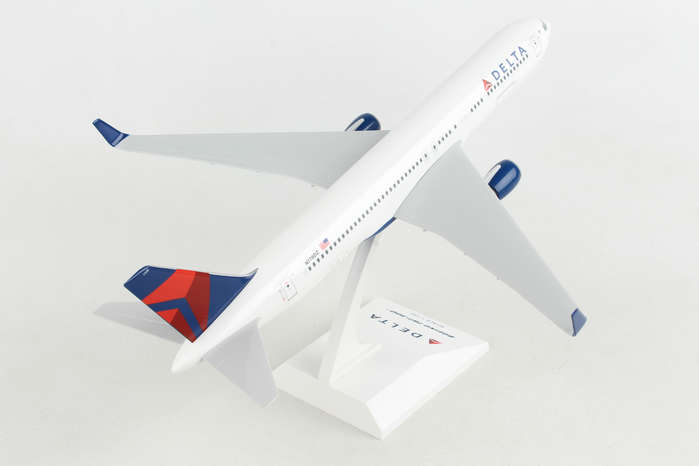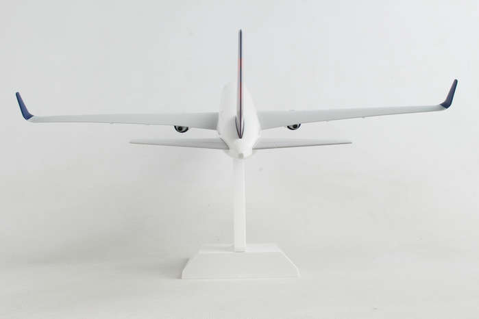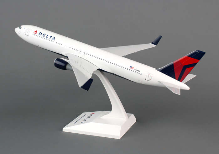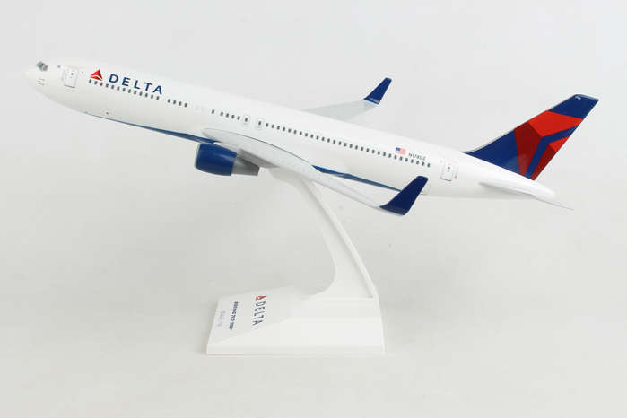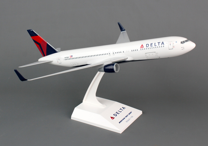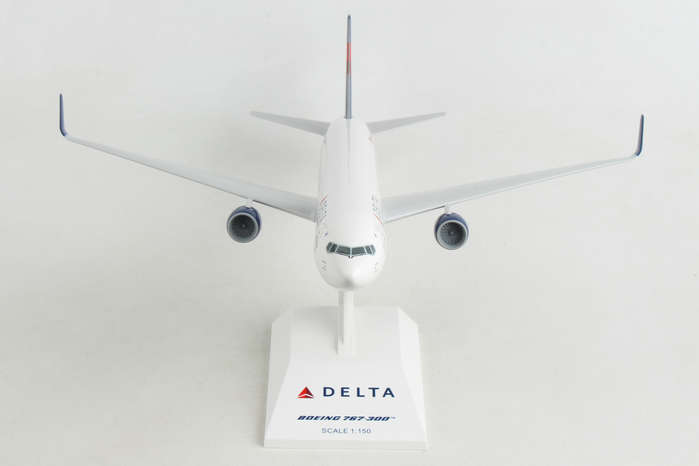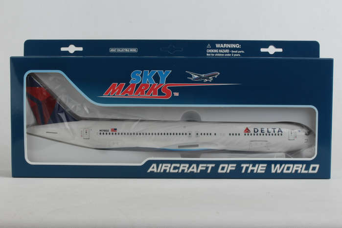 Comprising superior quality, solid, substantial injection molded plastic components with a simple snap-fit design that allows for easy assembly without the need for glue, this SkyMarks 1/150 scale Delta Airlines Boeing 767-300 measures approximately 14-7/16-inches long with a 14-3/8-inch wingspan and comes complete with a Display Stand. An accurate, true-to-scale reproduction of the actual aircraft, the model is great for collectors and features authentic, highly detailed graphics and markings. The wide-body, twin-engine Boeing 767 jetliner was introduced by the company to complement its larger Boeing 747 by serving specific markets that were not practical for or could not be served by the bigger plane. The Boeing 767 enabled seven abreast cross seating and featured Boeing's first two-crew glass cockpit, which was jointly developed for the 757, not only permitting a common pilot type rating, it did away with the necessity for a flight engineer, forever changing the architecture of the cockpit. Having entered service in September 1982 with United Airlines as the launch customer for the Boeing 767-200, Boeing subsequently released five further variants of the 767, including the extended range 767-200ER in 1984, the stretched 767-300 in 1986, and the extended range 767-300ER in 1988, which was the most popular variant of the line. Boeing then introduced its first freighter version of the 767 in 1995, the 767-300F followed by the 767-400ER, a second stretched passenger version of the aircraft that was released in 2000. Initially used for U.S. transcontinental flights, after the International Civil Aviation Organization (ICAO) established the special flight regulations via ETOPS (Extended-Range Twin-Engine Operations Performance Standards), an acronym pertaining to established rules and parameters by which twin-engine aircraft must operate. The Boeing 767-300 was the first stretched version of the aircraft and entered service with launch customer Japan Airlines in 1986. Approximately 21 feet longer than the preceding Boeing 767-200 aircraft, because a stretched variant was incorporated into the initial design of the Boeing 767, much of the original aircraft remained primarily unchanged. Manufactured from 1986 until 2000, with a total of 104 aircraft having been produced, the expanded Boeing 767-300 has been utilized extensively on high-density routes in Asia and Europe. Model Size: Wing Span 12 1/2", Length 14 1/4"