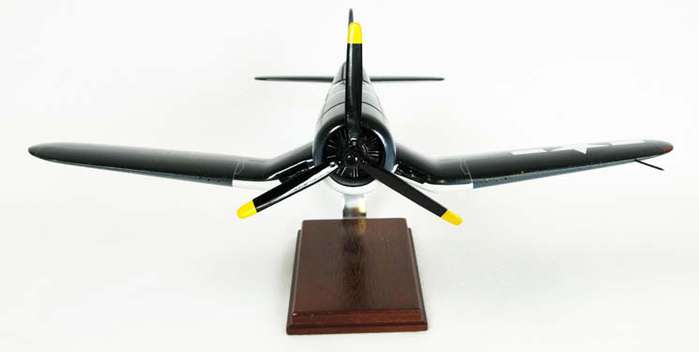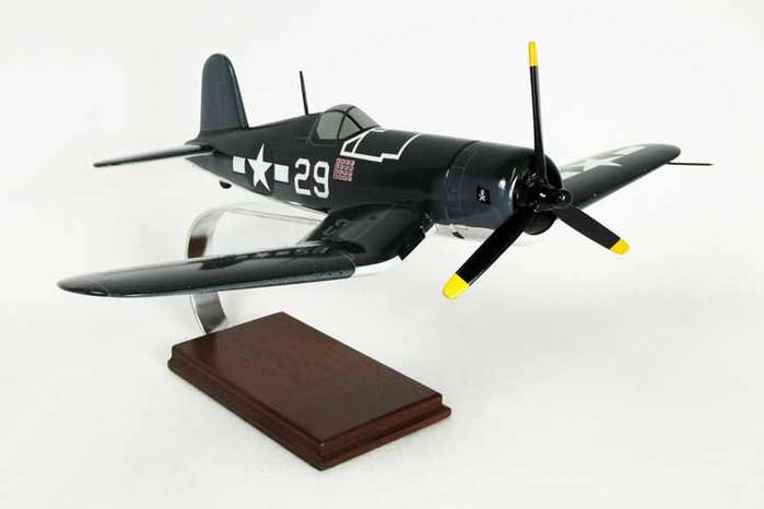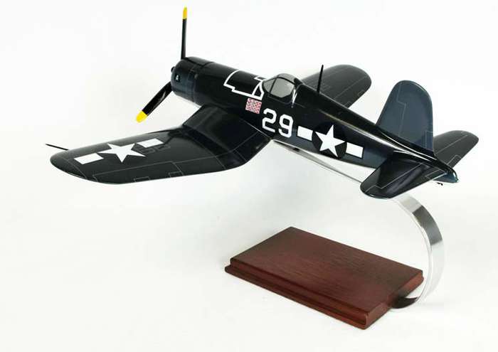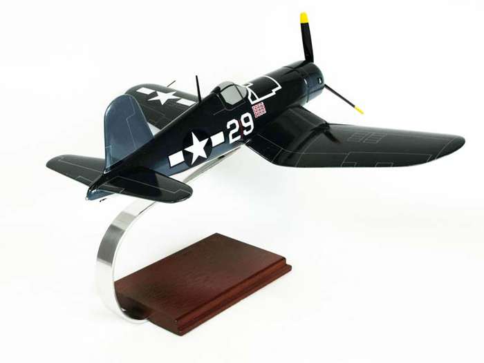 The F4U Corsair is an American fighter-bomber aircraft that saw service primarily in World War II and the Korean War. The Corsair was designed as a carrier-based aircraft and had the distinctive inverted gull wing, but had carrier landing issues, so the Marine Corps deployed the Corsair to widespread and devastating effect from land bases. After its landing issues were resolved, it quickly became the most capable carrier-based fighter-bomber of World War II. This high quality replica is crafted from mahogany wood and comes with a wooden base. Length is 14" and wingspan is 17.6".