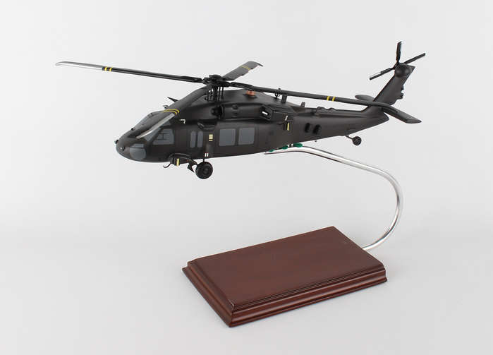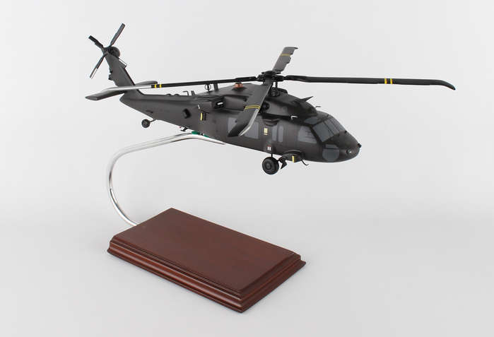 The UH-60 Black Hawk is a four-bladed, twin-engine, medium-lift utility helicopter manufactured by Sikorsky Aircraft. This high quality replica is handcrafted from wood and comes with a wooden base. Length is 19.5" and rotorspan is 16".