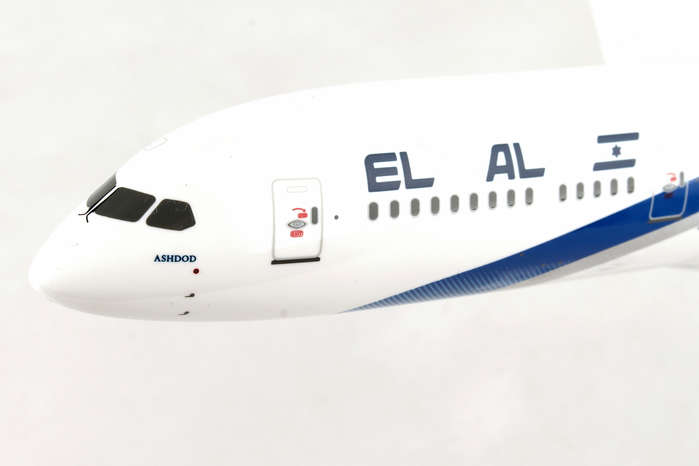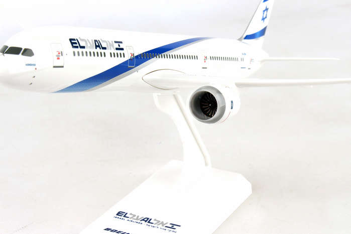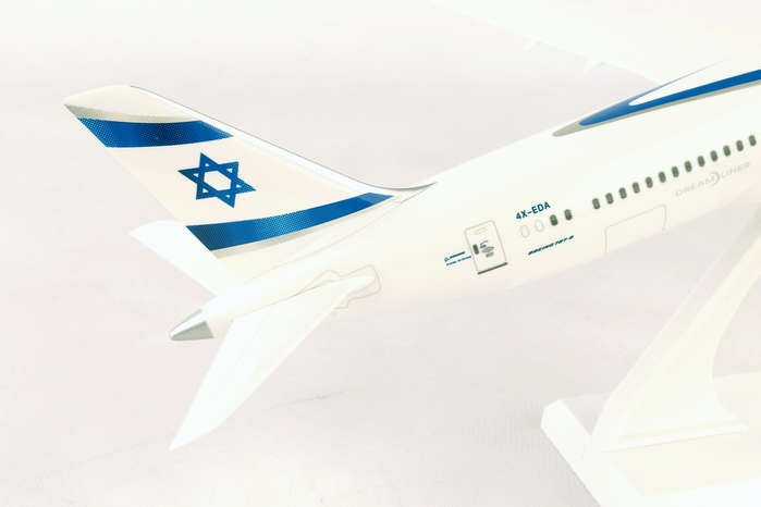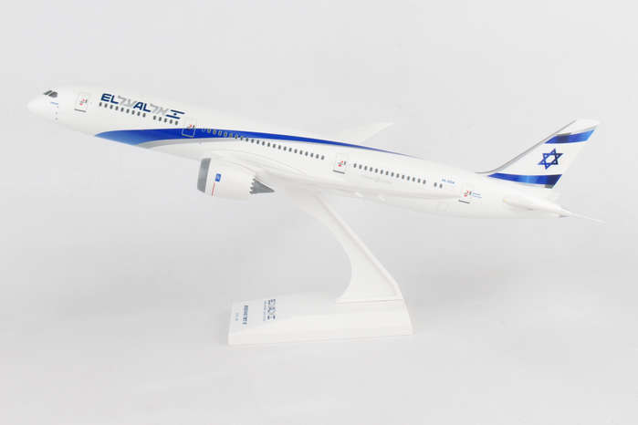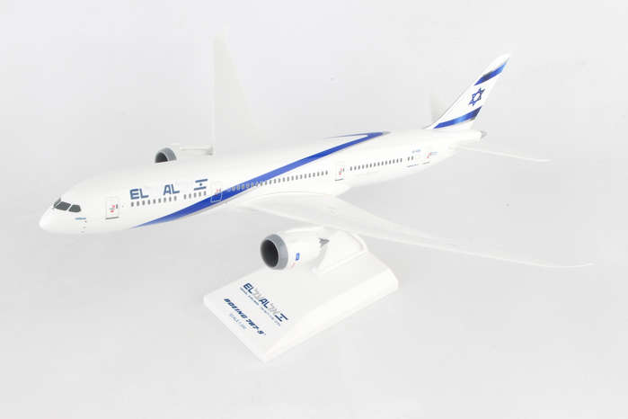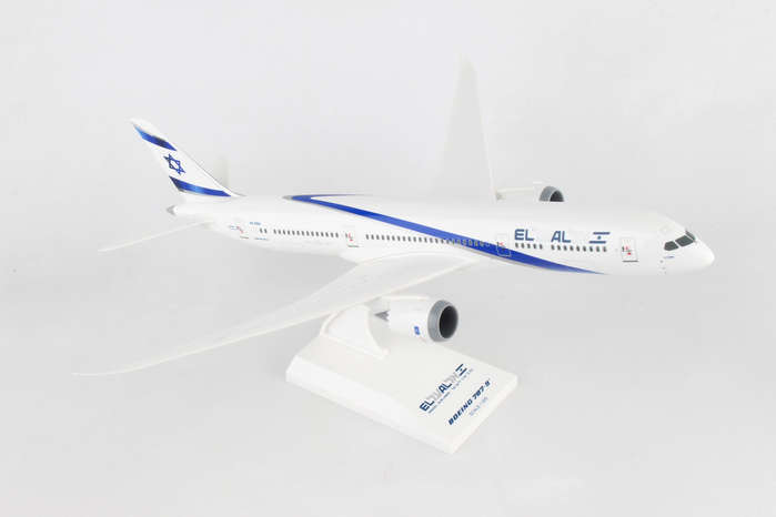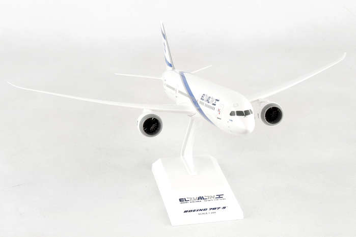 Comprising superior quality, solid, substantial injection molded plastic components with a simple snap-fit design that allows for easy assembly without the need for glue, this SkyMarks 1/200 Scale EL AL Boeing 787-9 Dreamliner - Registration 4X-EDA - measures approximately 12-3/8-inches long with a 12-1/8-inch wingspan and comes complete with a Display Stand. An accurate, true-to-scale reproduction of the actual aircraft, the model is great for collectors and features authentic, highly detailed graphics and markings. Having commenced service with the introduction of the Boeing 787-8 Dreamliner in 2011 as a more fuel-efficient, environmentally friendly successor to the aging Boeing 767, as market demand for the Boeing 747 and 767 had begun to slow down, the innovative, twin engine, wide-body Boeing 787 Dreamliner is currently offered in three different versions that can be configured to seat from 248 up to 336 passengers and is recognized by its prominently curved aerodynamic wings with raked back wingtips and chevrons on its engine nacelles. Technologically advanced with state-of-the-art avionics, electronics systems and an airframe that primarily comprises lightweight composite materials, the Boeing 787 Dreamliner can fly ultra-long-haul, non-stop, point-to-point routes up to 8,500 nautical miles where bigger aircraft cannot be accommodated or are financially justifiable, and offers improved cabin noise and oxygen levels, larger windows, and a very spacious interior design for maximum flying pleasure. Intended to replace the aging Boeing 767-300ER, the Boeing 787-9, which went into service in 2014, is a lengthened version of the launch version Boeing 787-8 with a higher maximum takeoff weight, and because of its increased range over the launch model, can fly 296 passengers to an even greater number of non-stop routes with exceptional efficiency.