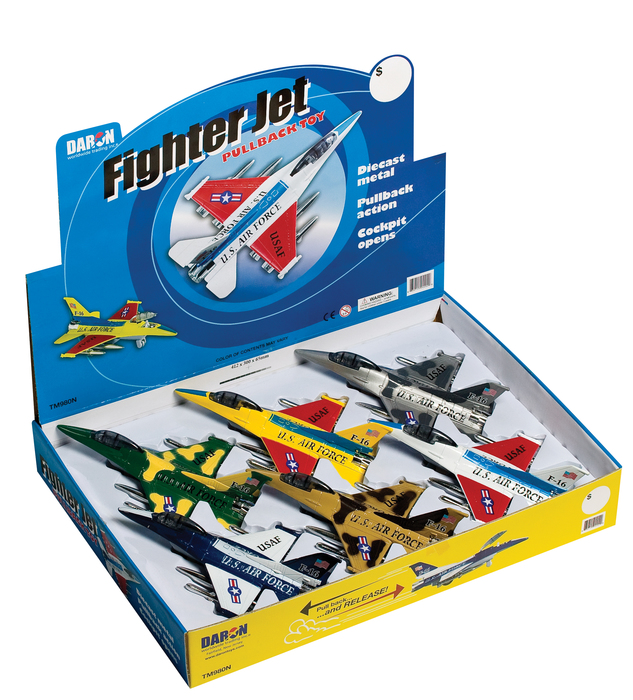 This six piece assortment of die cast fighter jet planes features pieces of different styles and colors, each complete with pullback action and an opening cockpit. 7.5" Ages 3+