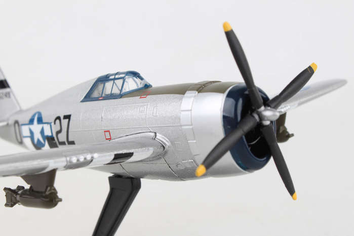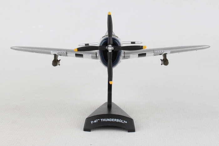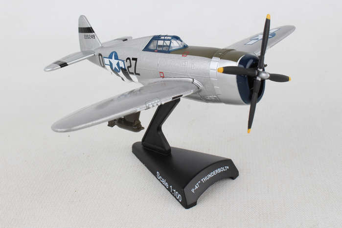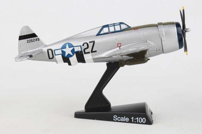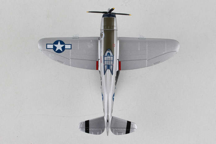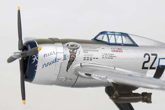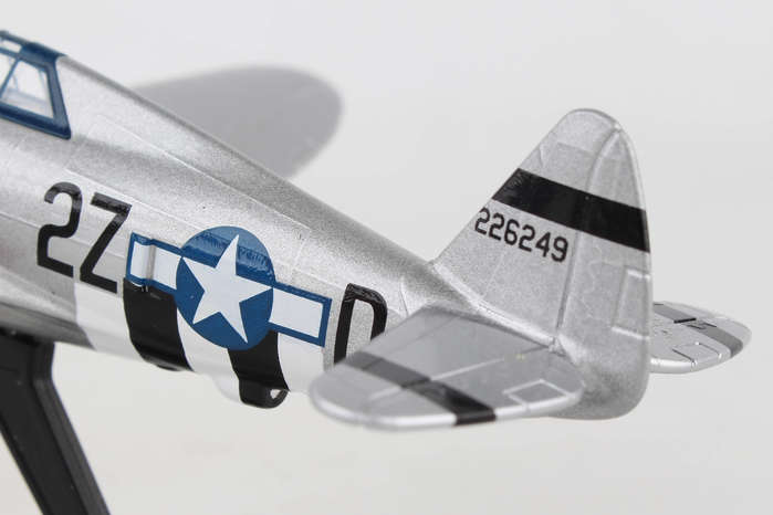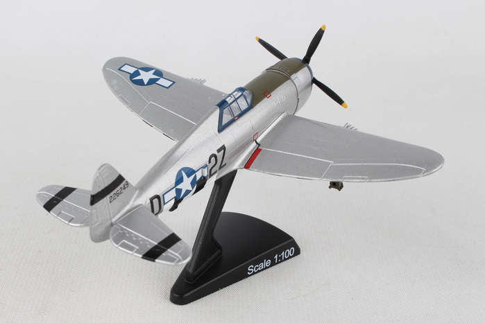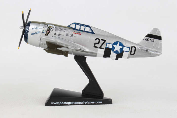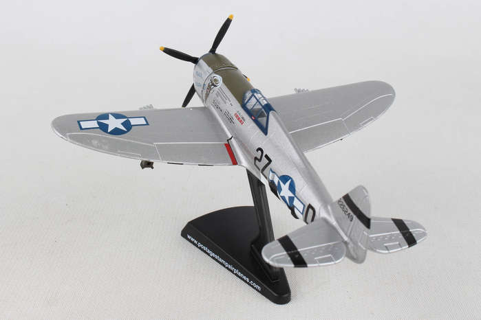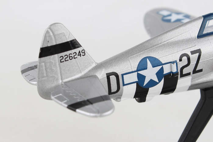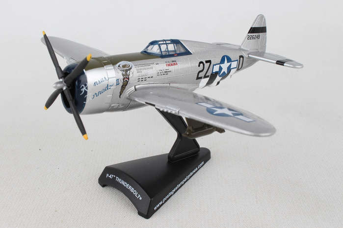 The P-47 Thunderbolt was a fighter-bomber used by the United States Army Air Forces during World War II with over 15,000 planes built during its operational lifetime. With the aid of drop tanks (auxiliary fuel tanks), the P-47 could cover long distances and was feared because of its eight .50 caliber guns. The P-47 was the heaviest single engine WWII fighter and the first piston powered fighter to exceed 500 mph. This P-47 has been painted to represent "Kansas Tornado II" flown by Capt. Howard Curran of the 510th Fighter Squadron, 405th Fighter Group based in St. Dizier, France during the fall of 1944. Size of model 4.75"L x 4.25" W Adult Collectible ages 14+