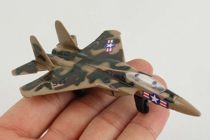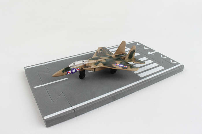 This die-cast metal model airplane comes with a foam rubber runway. Item is approximately 4 1/4 inches long, 2 7/8 inch wingspan, and 1 inch tall. Runway is 7 1/4 inches long, 4 inches wide and 1/4 inch thick. Ages 3+