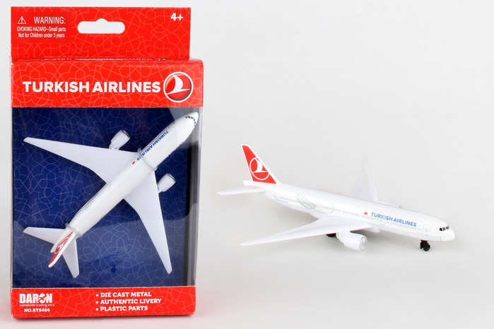 Fueled by your budding pilot's imagination, the DARON Turkish Airlines single Plane is ready to soar right out of the package on journeys to faraway, mysterious places around the world. Constructed from diecast metal and plastic parts with an authentic livery, the DARON Turkish Airlines Single Plane even has rolling wheels to ensure your furniture and floors remain unblemished during taxiing, takeoffs and landings. Perfect for little hands, the DARON Single Plane measures approximately 5-1/2-inches (L) x 5 3/4-Inches (W) x 1-Inch (H) and is intended for ages 3 and up.