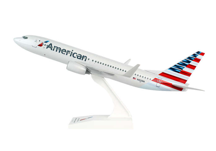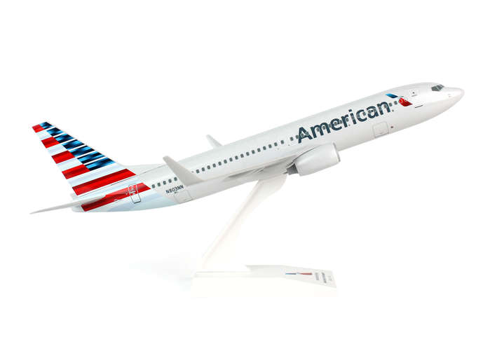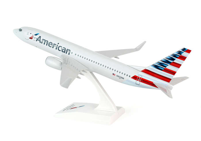 Comprising superior quality, solid injection molded plastic components with a simple snap-fit design that allows for easy assembly without the need for glue, SkyMarks 1/130 Scale American Airlines Boeing 737-800 measures approximately 11-3/4-inches long with a 10-1/2-inch wingspan and comes complete with a Display Stand. An accurate, true-to-scale reproduction of the actual aircraft, the model is great for collectors and features authentic, highly detailed graphics and markings. The Boeing 737-800 falls under the category of Boeing's 737 Next Generation aircraft, abbreviated 737NG, and was launched as the third-generation derivative of the 737 Classic. Substantially redesigned with numerous updates to the 737 Classic, the 737NGs primary competitor is the Airbus A320 series. The Boeing 737-800, which was introduced in September 1994, is a stretched version of the 737-700 and can be configured to generally seat between 162 and 189 passengers. Boeing delivered its final 737NGs in January 2020, having replaced it with the fourth-generation 737 MAX, which was introduced in 2017. This American Boeing 737-800 has been painted with the airline's new livery, which was introduced in 2013 as a clean and modern update. It features an abstract American flag on its tail along with a silver painted fuselage, which is vast departure from its prior livery, in which most of the surfaces were previously left unpainted, consequently reducing the aircraft's weight, which saved on fuel costs. Adult collectible ages 14+ Model Size: Wing Span 10 3/4", Length 12"