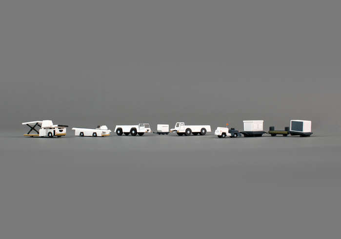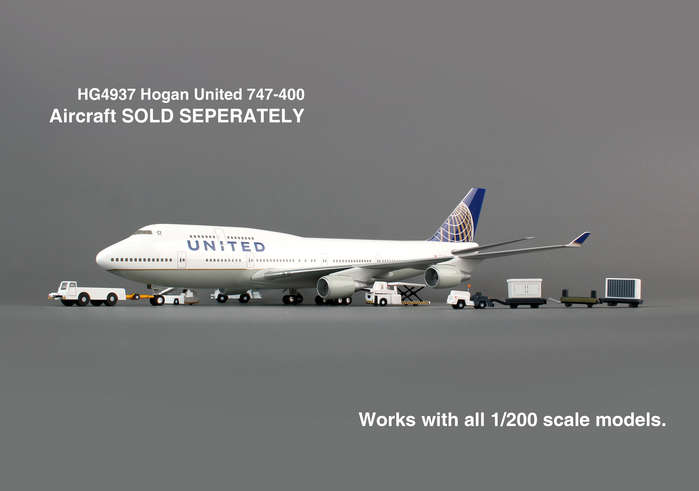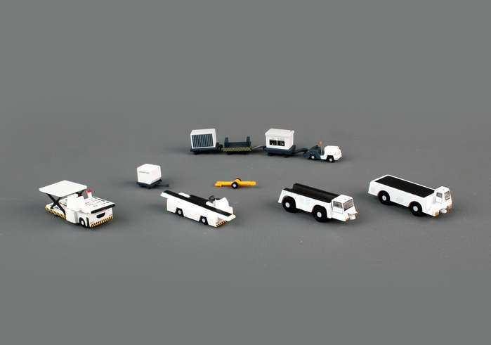 This 1/200 plastic ground equipment set contains a small tug, large tug, belt loader, pallet loader, ground power cart, container cart, covered baggage cart, open baggage cart and tow bar