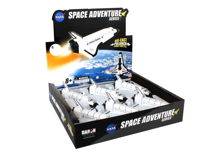 Die-cast metal space shuttle with pullback action. Approximately 7 1/2 inches long with 5 1/2 inch wingspan. Shuttle doors open. Ages 3+