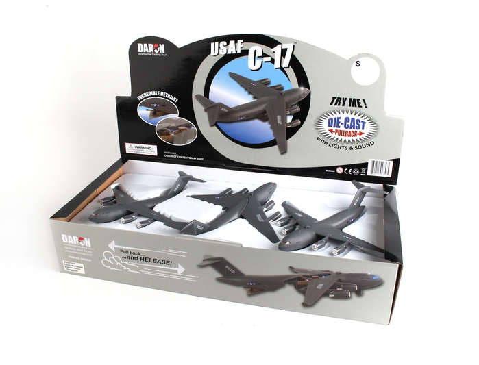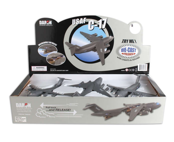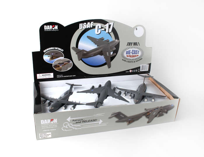 This die-cast/plastic C-17 has lights & sounds and pullback action. Display counter includes 6 pieces. Cargo doors open to show cargo interior/cargo.