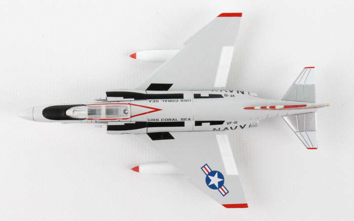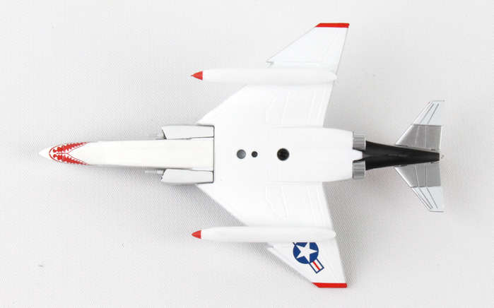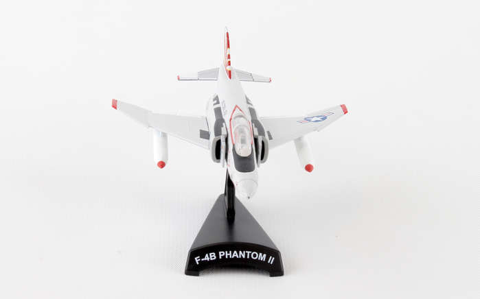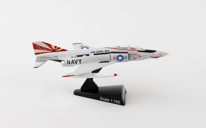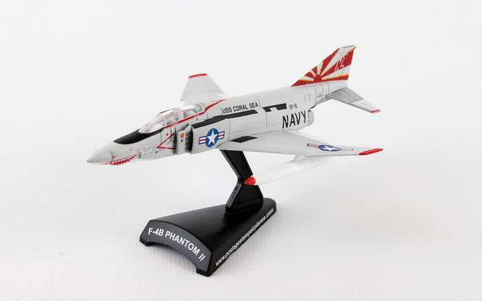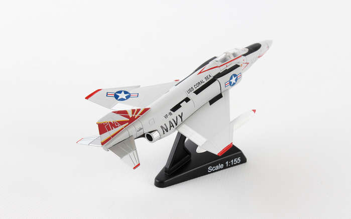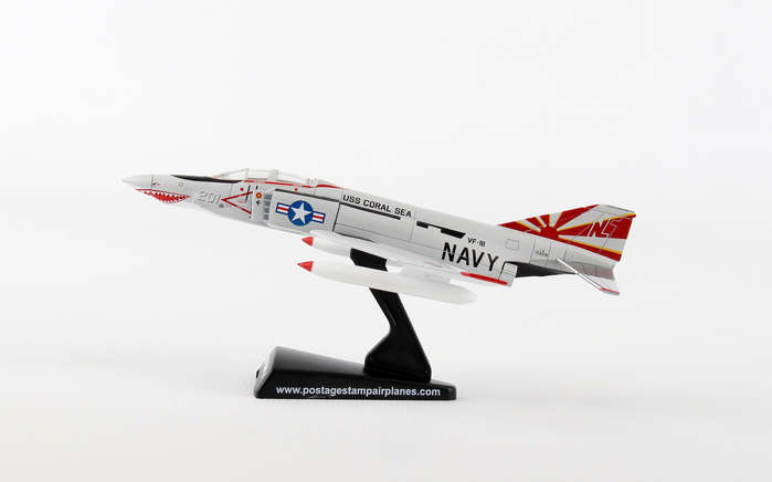 The McDonnell Douglas F-4 Phantom II is regarded as one of the most successful fighter designs of all time. An American two-seat, twinjet, all weather interceptor, fighter / fighter-bomber aircraft, its first flight occurred on May 27, 1958. With top speeds more than twice the speed of sound, the F-4 established 16 speed, altitude and time-to climb records. An all-around performer the F-4 Phantom II simultaneously served the USAF, USN and the USMC, the first American aircraft to do so, while also serving in approximately 11 other countries.Fighter Squadron 111 (VF-111), also known as the Sundowners is perhaps the most famous Pacific fleet squadron with an iconic insignia. During the Vietnam War, VF-111 made seven deployments, flying over 12,500 combat missions. In 1971, VF-111 joined CVW-15 (NL), on board CVA-43 USS Coral Sea, and transitioned to the F-4 Phantom II. During this deployment LT Weigand and LT JG Freckleton downed a MiG-17 on March 6, 1972 near the Tonkin Gulf. This Die-cast metal airplane model comes in 1:155 scale with plastic stand and is approximately 4 7/8 inches long with 3 3/16 inch wingspan. Adult Collectible ages 14+