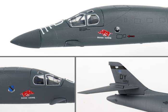 The Rockwell International (now Boeing) B-1B Lancer is a four-engine, supersonic, swing wing, jet powered, heavy strategic bomber. Used by the United States Air Force, it is primarily a low-level penetrator. The B-1B has long range capability and travels at high altitude with speed of Mach 1.25, and at low level speed of Mach 0.92. The B-1B celebrated its first flight on December 23, 1974 and became operational in 1986 with USAF Strategic Air Command as a nuclear bomber. In early 1990s B-1B fleet was reassigned to Air Combat Command and aircrafts were converted to use conventional and all-weather guided