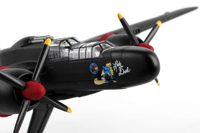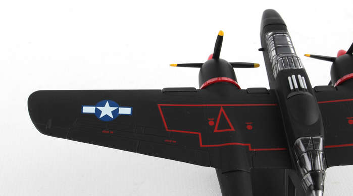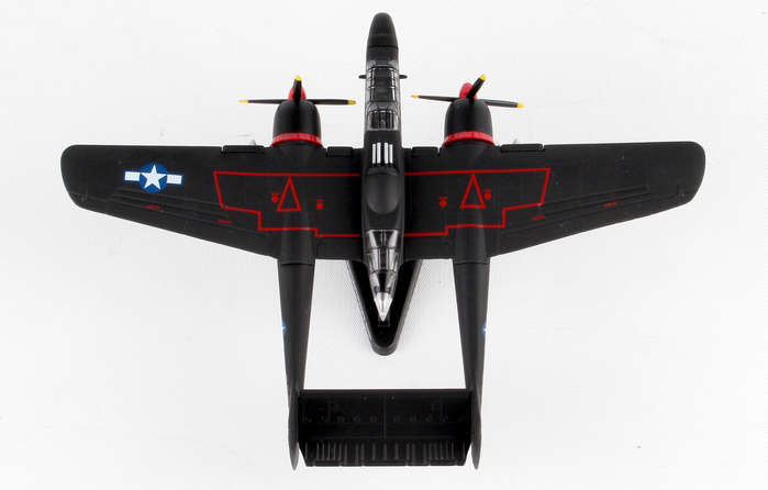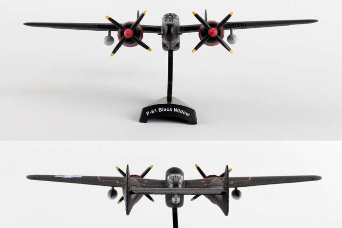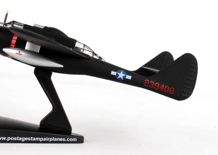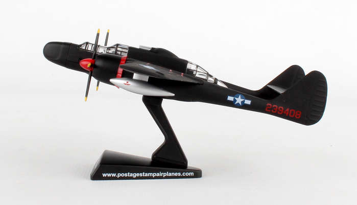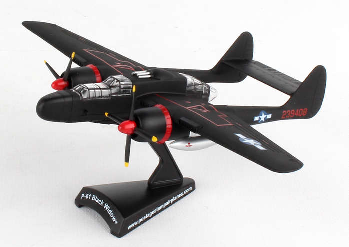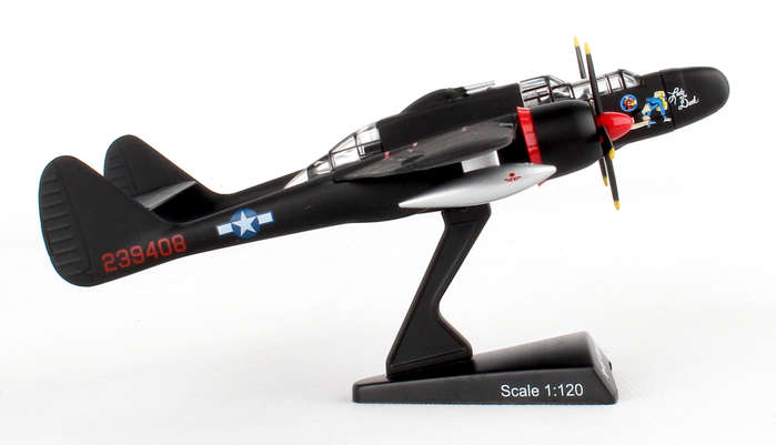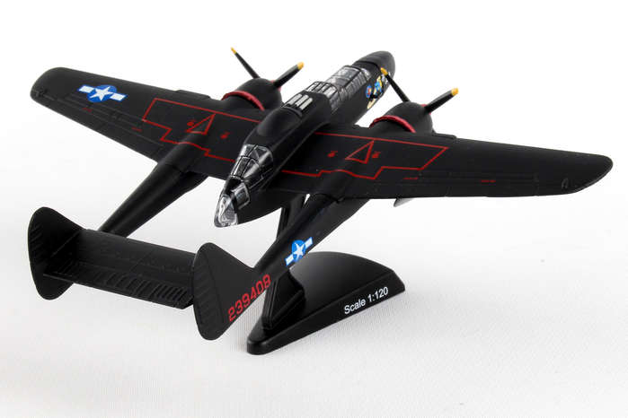 The Northrup P61 Black Widow is a twin-engine, twin-boom fighter aircraft manufactured by Northrup Corporation. It was used by United States Army Air Forces USAAF squadrons during World War II. It was the first USA warplane equipped with airborne radar and was designed from the ground up as a night fighter primarily tasked to intercept the Luftwaffe bombers attacking London at night. Lady in the Dark of the 548th Night Fighter squadron was probably the most famous Black Widow of the War. Credited as the last scoring plane of WWII, the Lady achieved this last victory without firing a shot, but by forcing two imperial Japanese fighters into the sea on the night of 15 August 1945. This die-cast metal, model airplane comes in 1/120 scale with plastic stand. No gear. Model is approximately 4 3/4 inches long with 6 1/2 inch wingspan. Adult collectible 14+