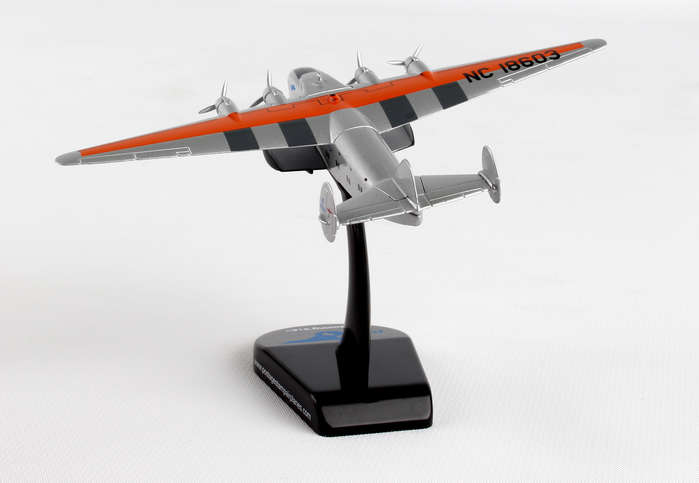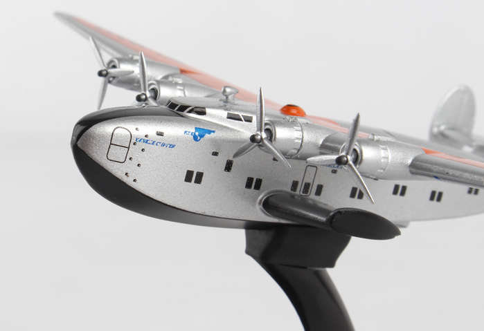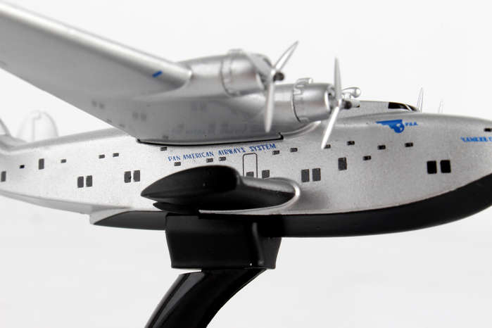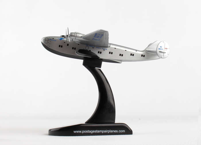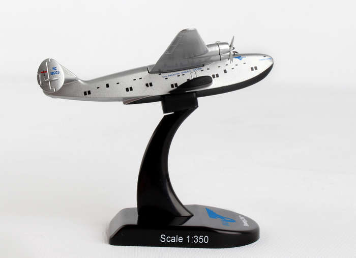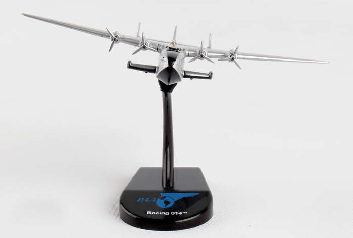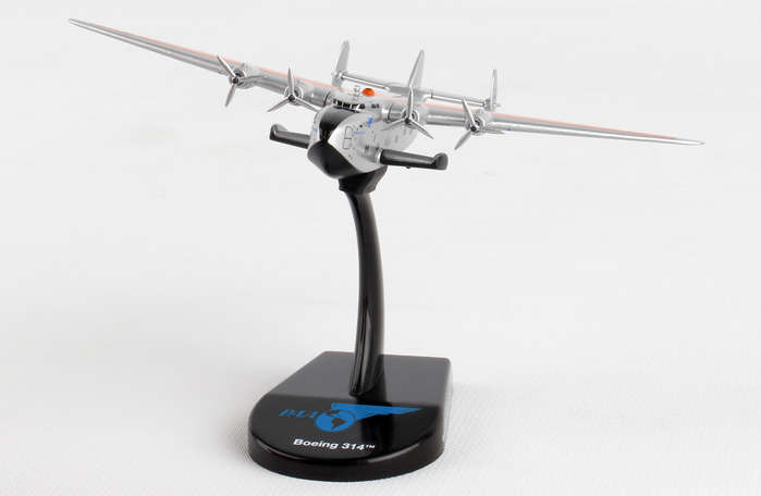 The Boeing 314 Clipper was a long-range flying boat made by the Boeing Airplane Company and operated by Pan American World Airways from 1939-1946. The 314 used a series of thick ribs and spars to create a robust fuselage and cantilevered wing, with no external struts to brace the wings. Boeing also eschewed pontoons and instead built in sponsons into the hull structure for stability while floating in water. A large aircraft for its day, the B-314 weighed over 40 tons and had a 152 feet wingspan, with an astonishing range of 3,500 miles, enough to cross either the Atlantic or Pacific. Pan Am designed their Clippers for luxury air travel; the B-314 could carry 74 passengers and 10 crew, although in overnight sleeper configuration, the ship accommodated 36 passengers in seven luxurious compartments, complete with lounge and dining area. Big, safe, and luxurious, the 314 was the apex of flying boat technology, and Pan Am made it the finest way to fly. Adult Collectible ages 14+ Over the course of their careers, the B-314's operated by Pan Am made approximately 5,000 ocean crossings and flew more than 12.5 million miles, including in military service during World War II. This model is 3 1/2 inches long with a 5 inch wingspan