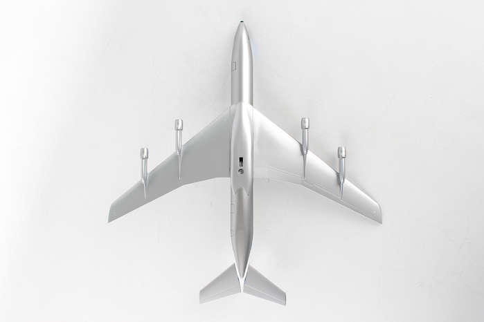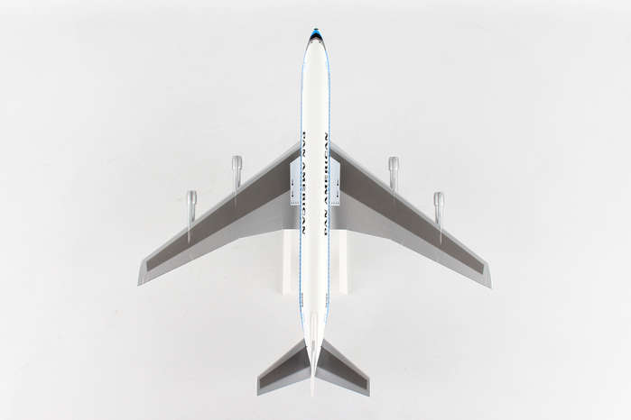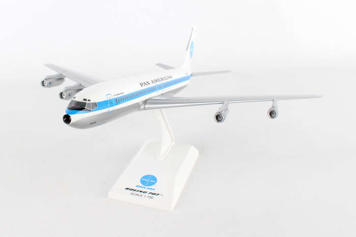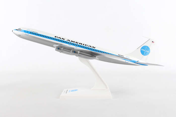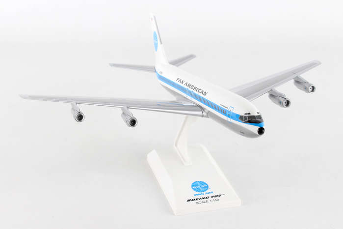 Comprising superior quality, solid injection molded plastic components with a simple snap-fit design that allows for easy assembly without the need for glue, SkyMarks 1/150 Scale Pan American Boeing 707 measures approximately 12-inches long with an 11-inch wingspan and comes complete with a Display Stand. An accurate, true-to-scale reproduction of the actual aircraft, the model is great for collectors and features authentic, highly detailed graphics and markings. Pan Am was the launch customer for the Boeing 707, which went into service in October 1958 with its first scheduled flight from New York Idlewild - now JFK - to Paris Le Bourget, with a stop at Gander to refuel. The Boeing 707 was developed as a long range, intercontinental, narrow body aircraft that could carry approximately 200-passengers, and has not only been credited with having initiated the jet age, it was also the most popular jetliner of its time.