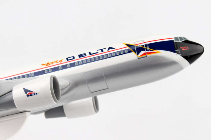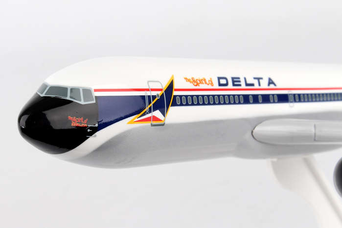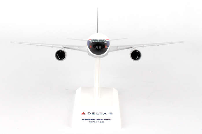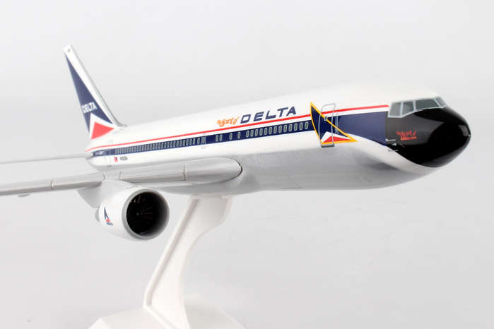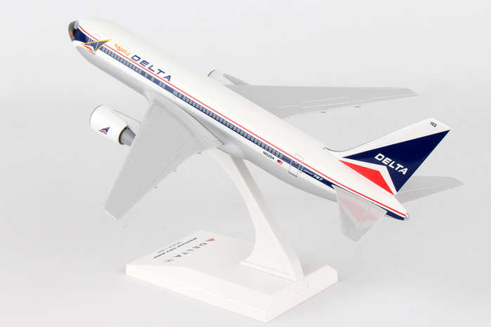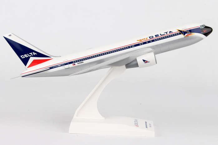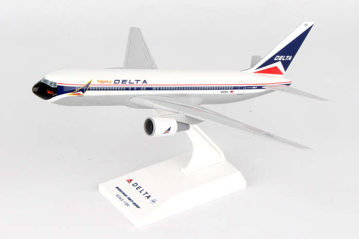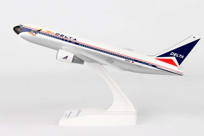 Comprising superior quality, solid, substantial injection molded plastic components with a simple snap-fit design that allows for easy assembly without the need for glue, this SkyMarks 1/200 scale Delta Airlines Boeing 767-200 measures approximately 9-5/8-inches long with a 9-1/2-inch wingspan and comes complete with a Display Stand. An accurate, true-to-scale reproduction of the actual aircraft, the model is great for collectors and features authentic, highly detailed graphics and markings. The wide-body, twin-engine Boeing 767 jetliner was introduced by the company to complement its larger Boeing 747 by serving specific markets that were not practical for or could not be served by the bigger plane. Although aesthetically somewhat conventional in appearance, the Boeing 767 enabled seven abreast cross seating and featured Boeing's first two-crew glass cockpit, which was jointly developed for the 757, not only permitting a common pilot type rating, it did away with the necessity for a flight engineer, forever changing the architecture of the cockpit. Having entered service in September 1982 with United Airlines as the launch customer for the Boeing 767-200, Boeing subsequently released five further variants of the 767, including the extended range 767-200ER in 1984, the stretched 767-300 in 1986, and the extended range 767-300ER in 1988, which was the most popular variant of the line. Boeing then introduced its first freighter version of the 767 in 1995, the 767-300F followed by the 767-400ER, a second stretched passenger version of the aircraft that was released in 2000. Initially used for U.S. transcontinental flights, after the International Civil Aviation Organization (ICAO) established the special flight regulations via ETOPS (Extended-Range Twin-Engine Operations Performance Standards), an acronym pertaining to established rules and parameters by which twin-engine aircraft must operate. This Delta Boeing 767-200, The Spirit of Delta, which was inspired by "Project 767," has quite an interesting history. According to Delta (deltamuseum.org), not only was the airline industry troubled by a weak economy, high fuel prices and deregulation, it was the first time in 35 consecutive years that Delta posted a net loss. To show support and express their appreciation for the airline, Delta's employees, led by three flight attendants, spearheaded "Project 767" to raise $30 million dollars to pay for Delta's first Boeing 767, N102DA, christened "The Spirit of Delta, which commenced service in December 1982. The Spirit of Delta was flown by the airline for more than 23 years and was painted in special liveries to commemorate the 1996 Atlanta Olympics and Delta's 75th Anniversary in 2004. The aircraft was retired in March 2006 and now resides on display in Historic Hangar 2 at the Delta Museum. Model Size: Wing Span 9 1/2", Length 9"