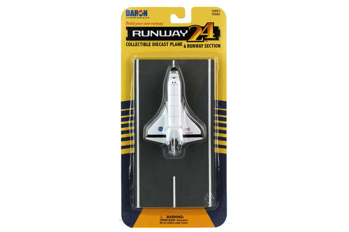 This die-cast metal space shuttle comes with a foam rubber runway. Item is approximately 4 inches long, 2 3/4 inch wingspan and 1 7/8 inches tall. Runway is 7 1/4 inches long 4 inches wide and 1/4 inch thick. Ages 3+