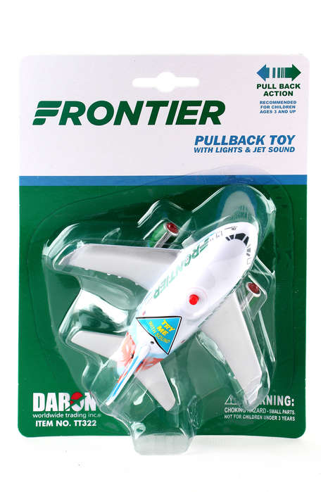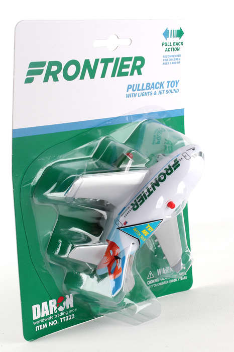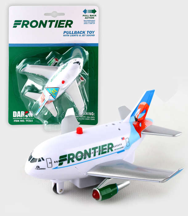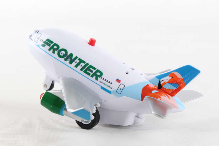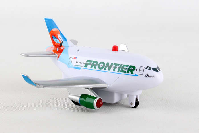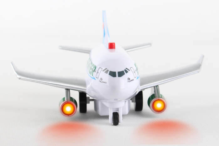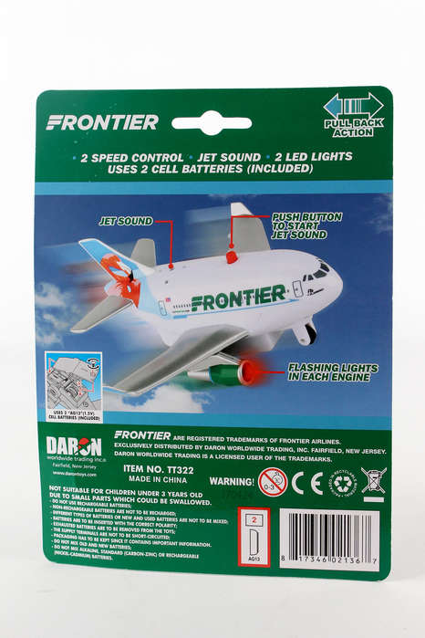 This stylized aircraft features electronic jet sound and flashing red lights, activated by the push of a button on top of the fuselage! Pull the plane back and let it go forward in the take-off position. Plastic construction. Approximately 5" long. Batteries included. Ages 3+