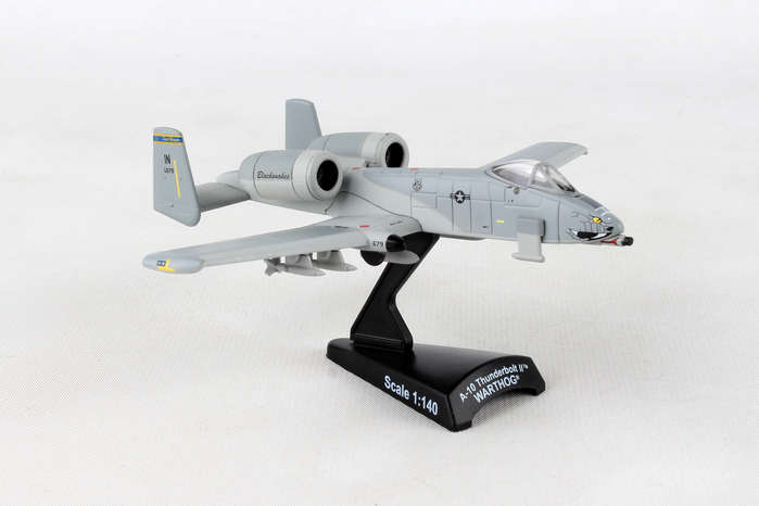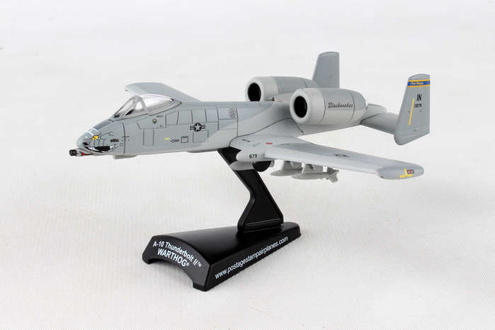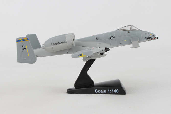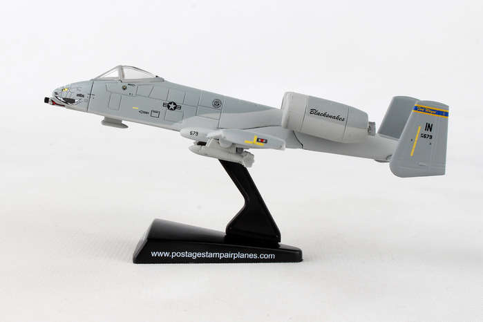 This Die-cast metal airplane model comes in 1:140 scale with plastic stand and is approximately 4 5/8 inches long with 5 inch wingspan. Adult Collectible ages 14+ The A-10 Thunderbolt II, more commonly known by the nicknames "Warthog" or "Hog", is a single-seat cantilever low-wing all metal monoplane used for close air support by the U.S. Air Force. The aircraft has superior loiter capabilities and maintains excellent maneuverability at low speeds and altitude because of its large wing area. The high wing ratio also allows short takeoffs and landings, and its simple design allows operations from forward airfields with limited facilities. The A-10 was designed for short-term response against enemy armored vehicles. The main feature of the plane is a nose-mounted 30mm GAU-8/A Avenger Gatling-type cannon. One of the most powerful aircraft cannons ever flown, it fires large depleted uranium armor-piercing shells. The 163rd Fighter Squadron is a unit of the Indiana Air National Guard 122nd Fighter Wing located at Fort Wayne, Indiana. They changed their names from Marksmen to Blacksnakes in 1997 for a less aggressive undertone. They have been operating A-10's since 2010.