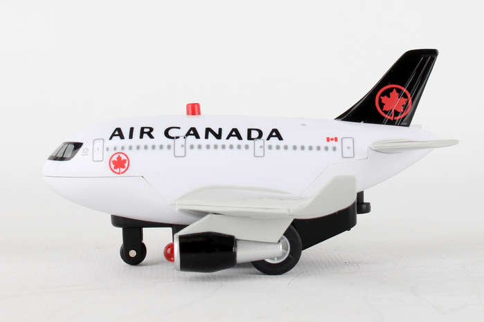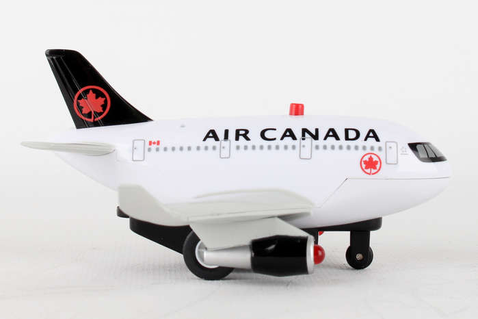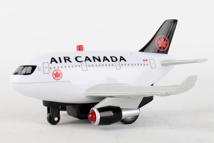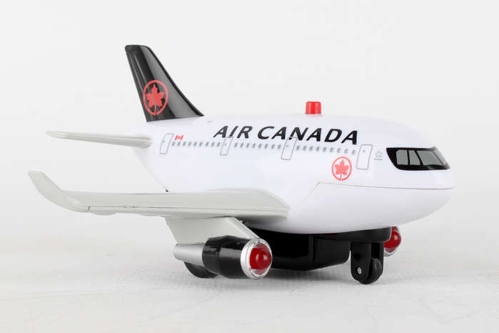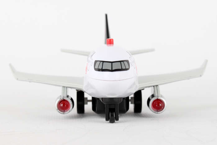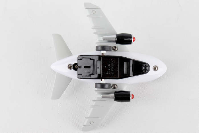This stylized aircraft features electronic jet sound and flashing red lights, activated by the push of a button on top of the fuselage! Pull the plane back and let it go forward in the take-off position. Plastic construction. Approximately 5" long. Batteries included. Ages 3+