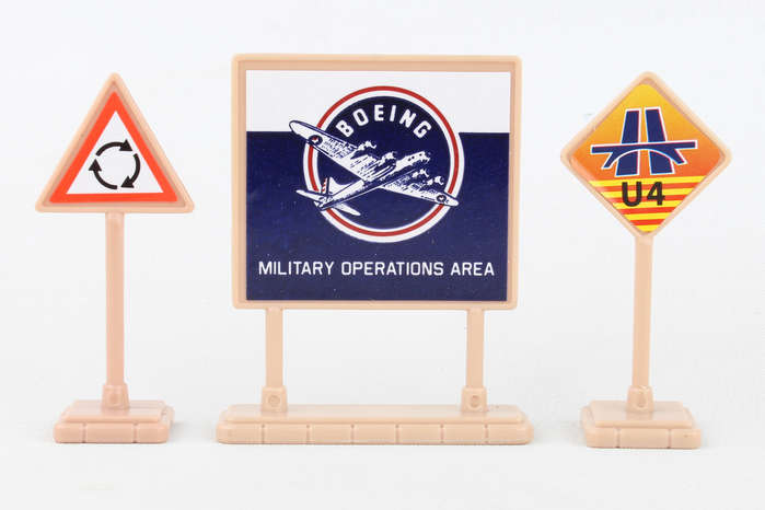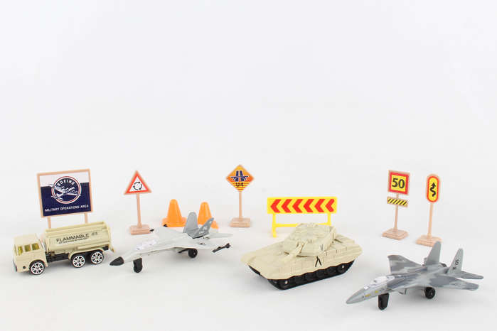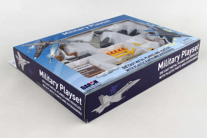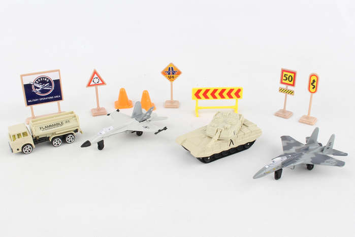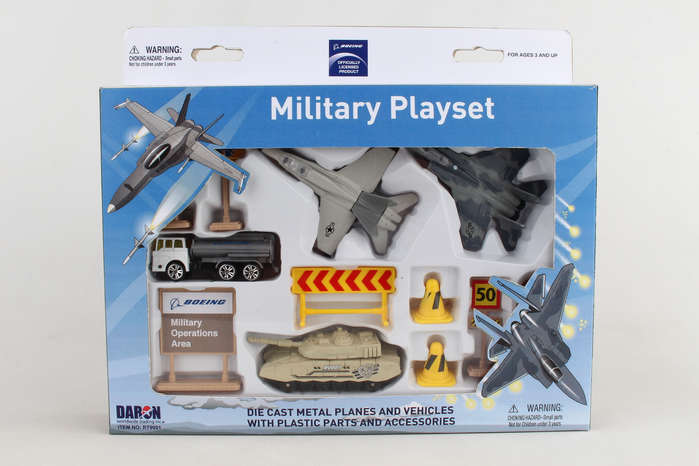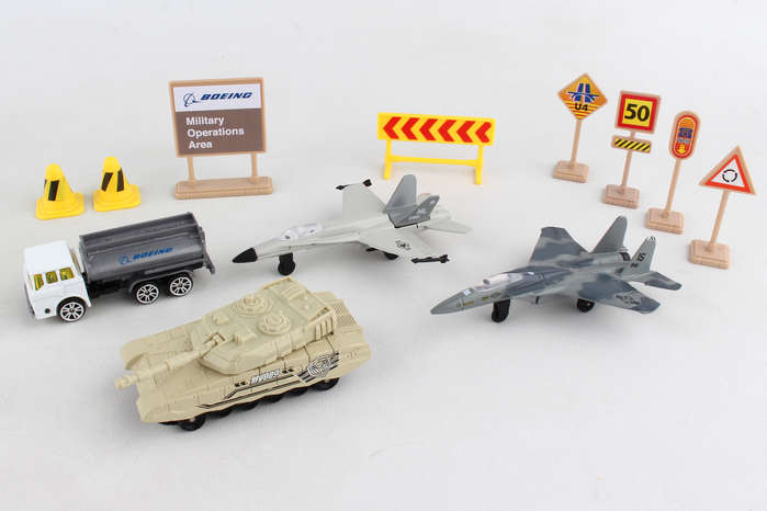 This Boeing military playset includes 2 aircraft, tank, vehicle and signs/accessories. Die-cast and plastic. Ages 3+