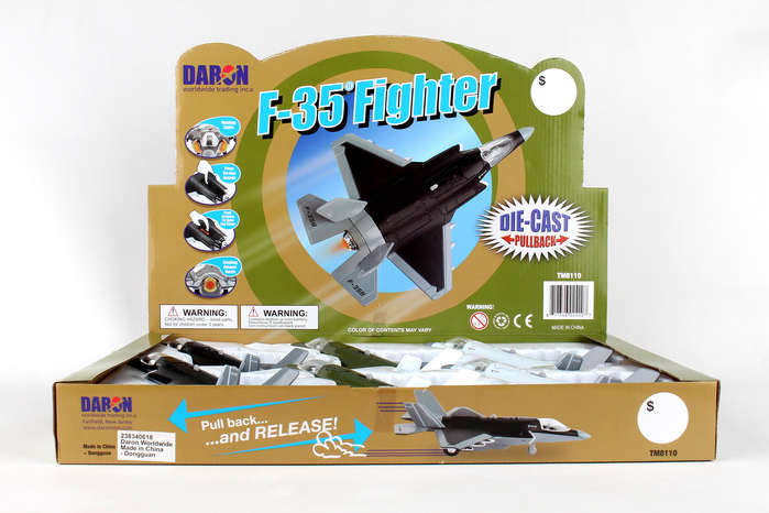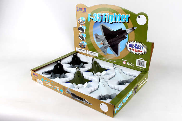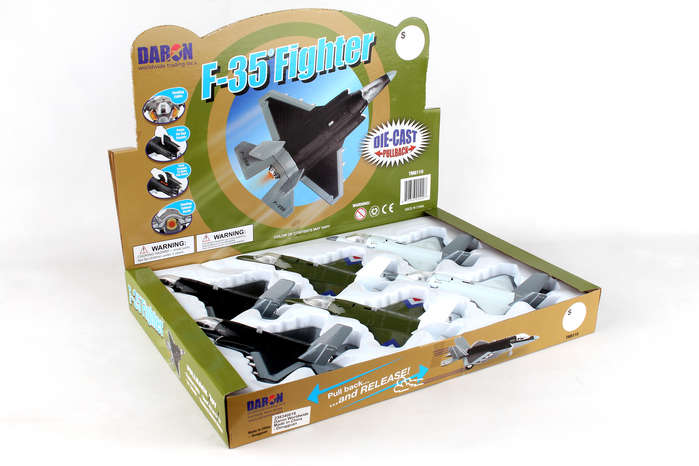 This die-cast F-35 pullback has lights & sound. Display box includes 6. Assorted colors.Ages 3+