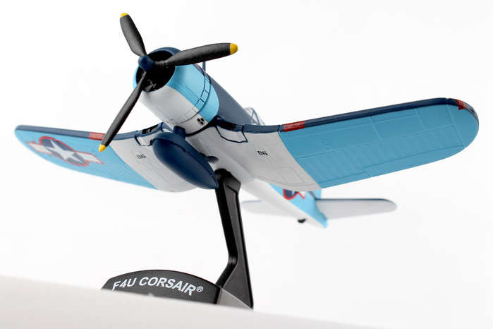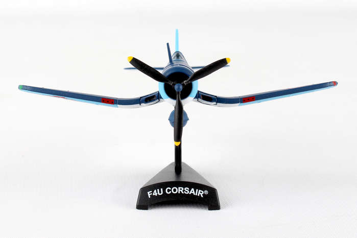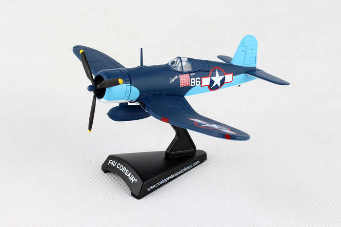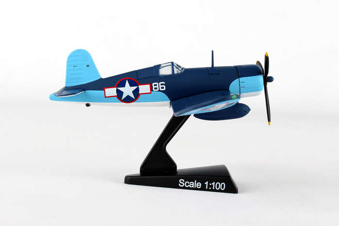 The F4U Corsair was a naval fighter aircraft used by the United States Navy and Marine Corps during World War II and the Korean War. Its excellent capabilities and performance made it very successful for the USMC. The F4U had a long production life span and was last produced in 1952. It had a max speed of 417 mph and carried six .50 caliber machine guns or four 20mm cannons, as well as a pair of 2000 lb. bombs and air rockets. F4U aircraft #86 was piloted by Maj. Gregory "Pappy" Boyington, Commanding Officer of the VMF-214 "Black Sheep" Squadron who fought their way to fame in the Pacific Theatre of World War II. Flying out of their home airfield out of Vella Lavella, the "Black Sheep" piled up a record 203 planes destroyed or damaged, troop transports and supply ships sunk, and ground installations destroyed in their first 84 days. Boyington himself claims a record 28 total kills. He was shot down on January 3, 1944 and was a prisoner of war for 20 months until the Japanese surrender. He was awarded both the Medal of Honor and Navy Cross on October, 1945. The mid-1970s television show "Baa Baa Black Sheep" was very loosely based on his memoirs. This Die-cast metal airplane model comes in 1:100 scale with plastic stand and model is approximately 4 inches long with 4 3/4 inch wingspan. Adult Collectible ages 14+