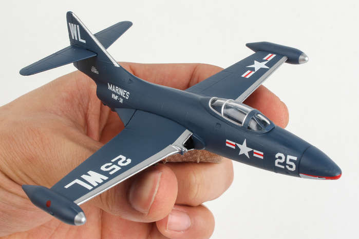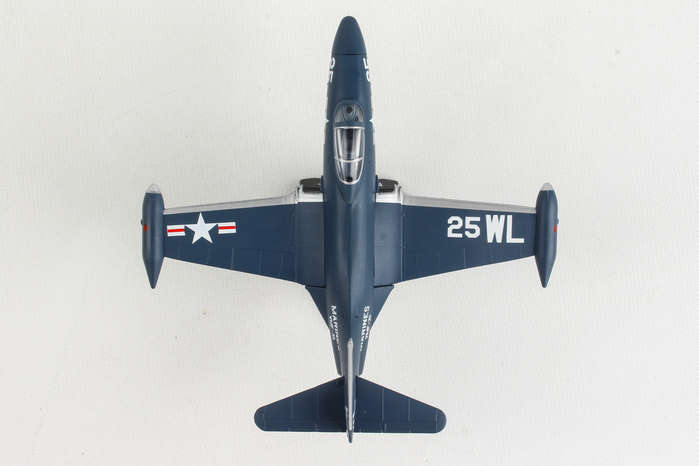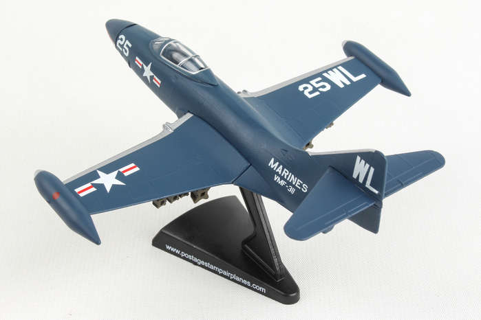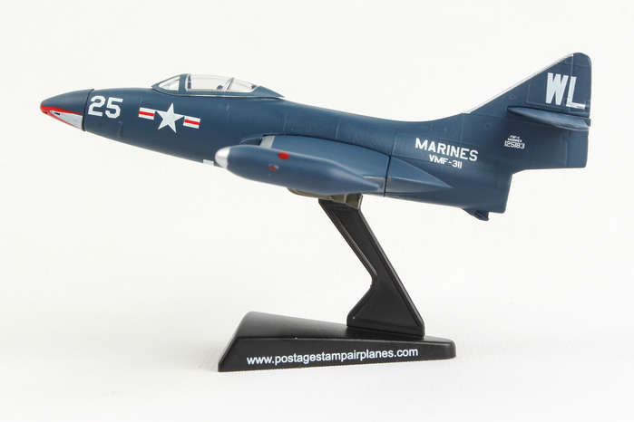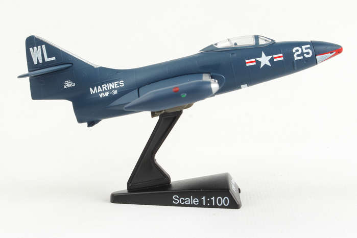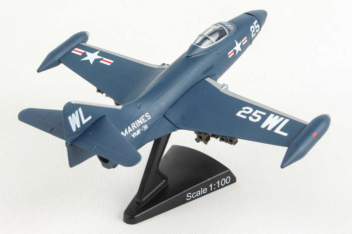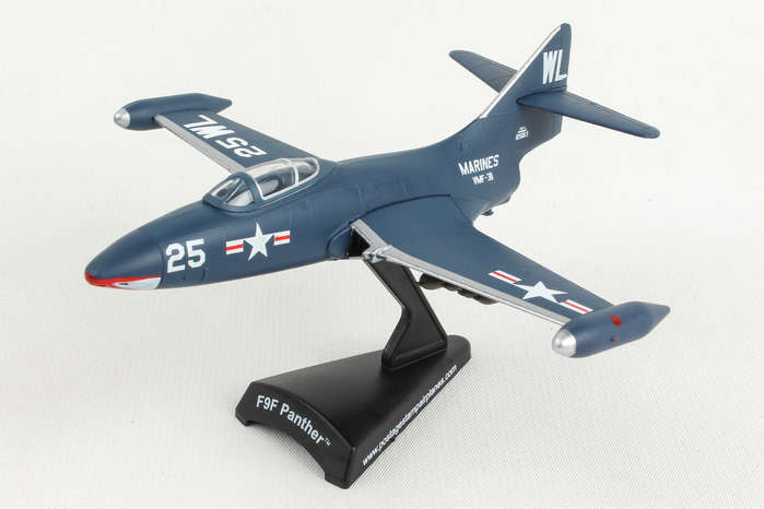 The F9F Panther was Grumman's first jet-powered aircraft and was used extensively by the US Navy and Marine Corps as their primary fighter and ground-attack aircraft in the Korean War. It was a single-engined carrier fighter with permanently mounted wing tip fuel tanks, armed with four 20 mm (0.79 in) cannons and a wide assortment of air-to-ground munitions. The Panther scored the first Navy air victory of the war by shooting down a North Korean Yak-9 and had underrated dog-fighting capabilities. But it was more famous as a tough bird that brought its pilots home, including three celebrated Korean War pilots: Boston Red Sox slugger Ted Williams and future astronauts John Glenn and Neil Armstrong. The model is approximately 4.75 inches in length and has a 5 inch wingspan. Adult Collectible ages 14+