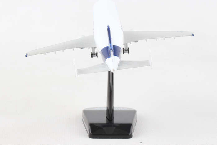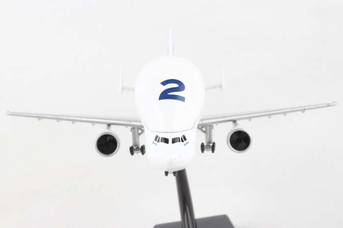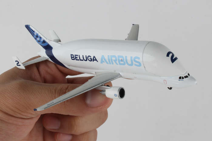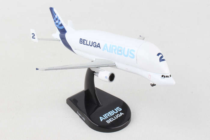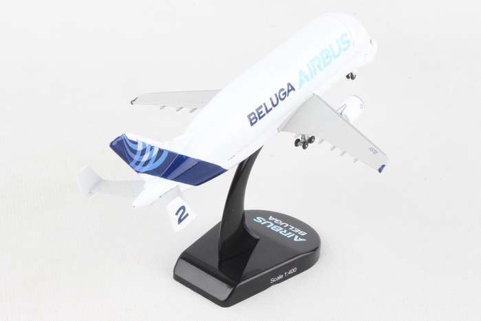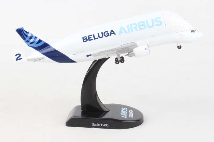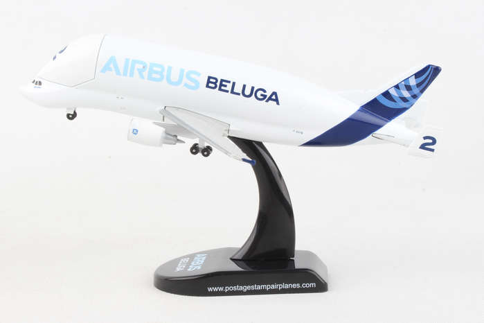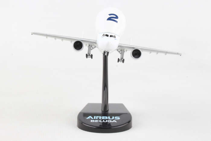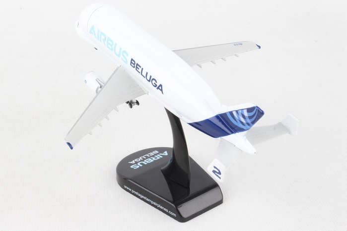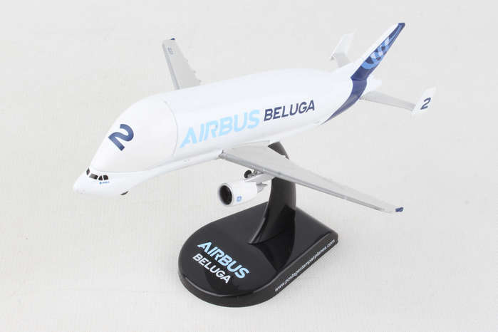 The Airbus A300-600ST is a version of the standard A300-600 wide-body airliner modified to carry aircraft parts and oversized cargo. It received the official name of Super Transport early on but it became more popularly known as the Beluga, a whale it physically resembles. The A300-600ST's freight compartment is 24 ft. in diameter and 124 ft long; the maximum payload is 47 tons. It is primarily used to ferry Airbus aircraft components from various manufacturers to the final assembly plant in Toulouse, France. It also performs special charter flights for various purposes. This model represents aircraft number two of the five-member Beluga ST fleet. Model is 5.625" L x 4.25"W Adult Collectible ages 14+