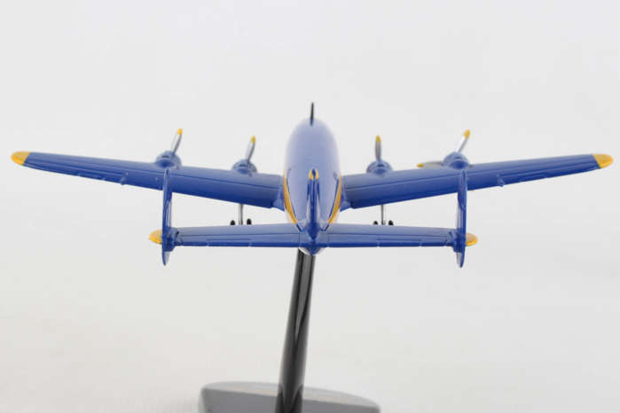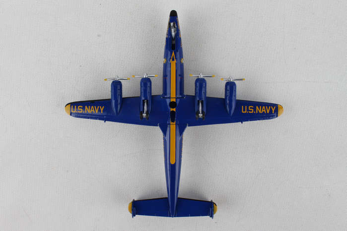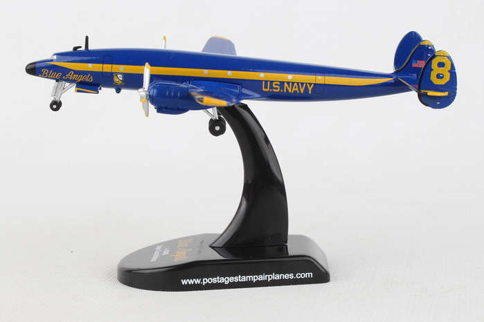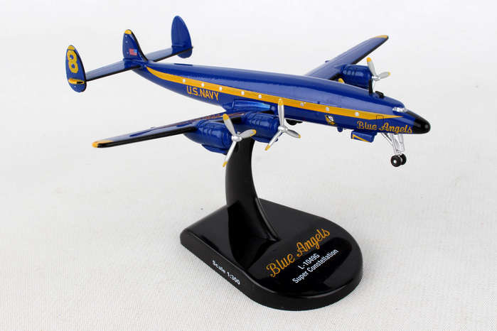 Lockheed L-1049 Super Constellation, aka "Super Connie", is a propeller-driven, four-engine commercial aircraft produced by Lockheed Corporation. It has the iconic triple-tail design and the distinctive dolphin shaped fuselage of all aircraft in the Constellation line. A military transport version is the C-121, used by the US Air Force and US Navy for various purposes. The Blue Angels are the US Navy's Flight Demonstration Squadron whose mission is to exhibit pride and professionalism through flight demonstrations. Established in 1946, the "Blues" used the Connie as their transport unit from 1969 until it was replaced by the C-130 in 1971. This die-cast metal model airplane comes in 1/300 scale with landing gear and plastic stand. Model is approximately 4 1/2 inches long with 4 3/4 inch wingspan. Adult Collectible ages 14+