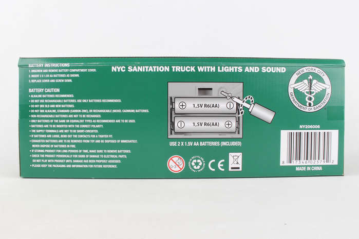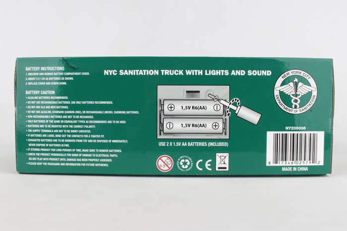 This certified NYC Sanitation Truck is approximately 12L x 7W. The Sanitation Truck is fully equipped with lights and unique sounds. The garbage can can be moved up and down and the rear door opens just like a real sanitation truck! All logos and marks are certified by the NYC Sanitation Department. Two 1.5V AA Alkaline Batteries are included with purchase. Recommended for children Ages 3+.