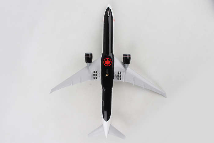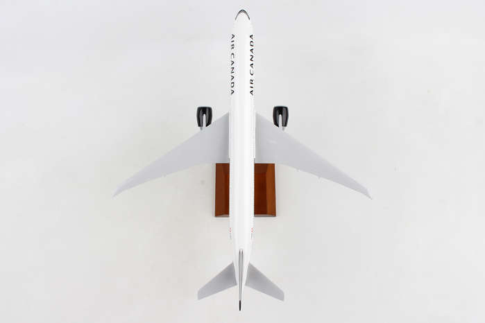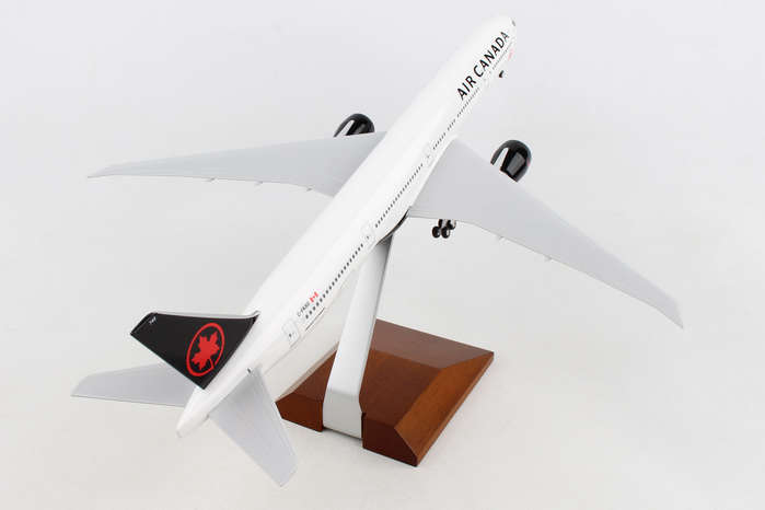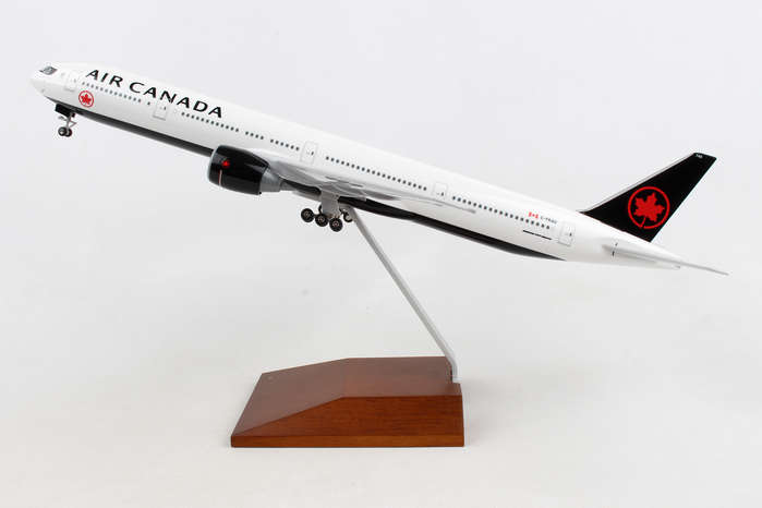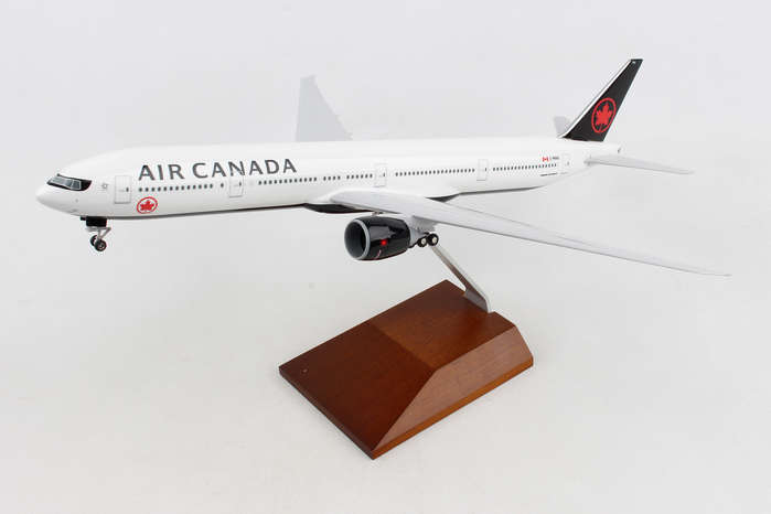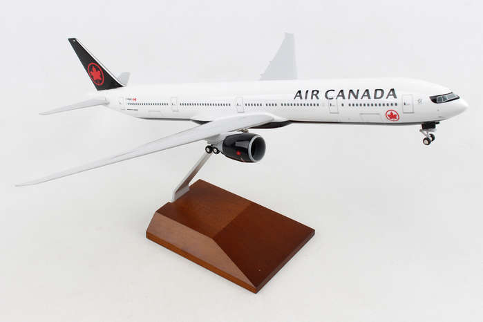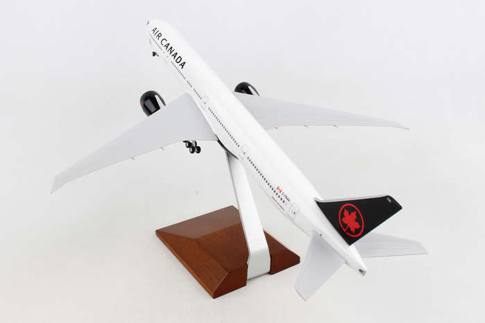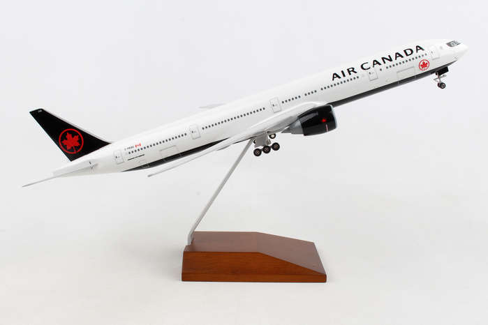 Comprising superior quality, solid, substantial injection molded plastic components with a simple snap-fit design that allows for easy assembly without the need for glue, this SkyMarks 1/200 scale Air Canada Boeing 777-300ER, with Registration C-FKAU, measures approximately 14-3/8-inches long with a 12-3/4-inch wingspan and comes complete with Landing Gear and a premium Wood Display Stand. An accurate, true-to-scale reproduction of the actual aircraft, the model is great for collectors and features authentic, highly detailed graphics and markings.