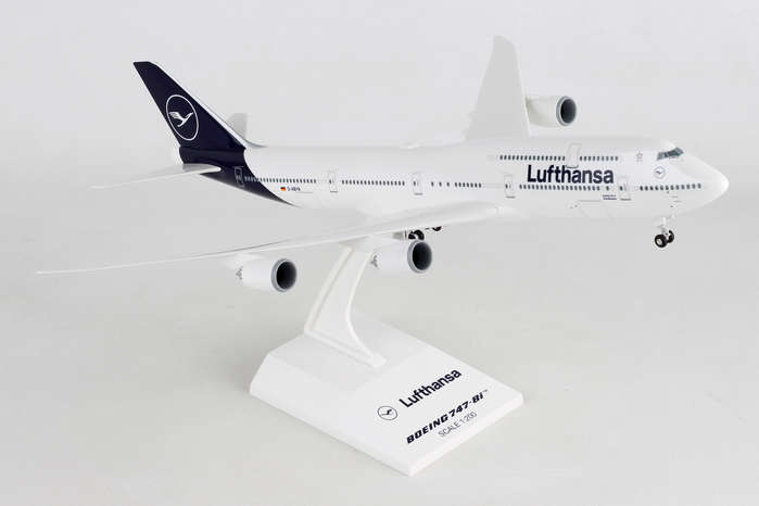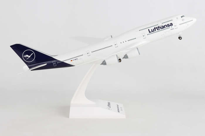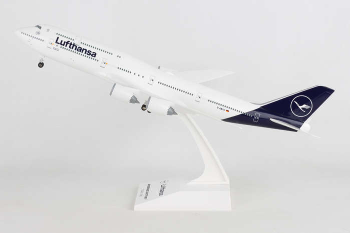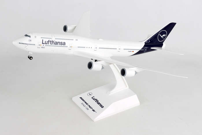 Comprising superior quality, solid, substantial injection molded plastic components with a simple snap-fit design that allows for easy assembly without the need for glue, this SkyMarks 1/200 scale Lufthansa Boeing 747-8i - Registration D-ABYA - measures approximately 15-1/16-inches long with a 13-5/8-inch wingspan and comes complete with Landing Gear and a Display Stand. An accurate, true-to-scale reproduction of the actual aircraft, the model is great for collectors and features authentic, highly detailed graphics and markings. Easily discernible from earlier 747 models by its prominently curved aerodynamic wings with raked back wingtips and chevrons on its engine nacelles, the Boeing 747-8i was initially introduced in 2005 as a larger, quieter and more advanced and fuel-efficient variant of its predecessor, the Boeing 747-400, and utilizes the same cockpit and engine technology as its sibling, the Boeing 787, which is acknowledged by the suffix, 8i after 747 (747-8i), with the "i" representative of "Intercontinental." Designed to carry more than 400 passengers approximately 8,000 nautical miles in a 3-class configuration, the Boeing 747-8i is also offered in a freighter variant with a noticeably shorter upper deck, called the 747-8f, which is furnished with a hinged opening nose door and side door, and boasts a greater payload capacity than its predecessor, the Boeing 747-400ERF, from which it was derived. While the Boeing 747-8f was delivered to launch customer Cargolux in late 2011, the first passenger version of the Boeing 747-8i was delivered to launch customer Lufthansa in mid-2012. Interestingly, the large, quad-engine Boeing 747 was initially conceived in the mid-1960s, when supersonic transports were also concurrently on the drawing board, and viewed more favorably at the time as the likely successor for the future travel, Boeing engineers and Pan Am CEO, Juan Trippe opted for the Boeing 747 to be designed so that it could be readily converted into a freighter if required by merely retrofitting the fixed nose of the existing passenger aircraft with a large hinged cargo door. Consequently, if a passenger 747 aircraft were ever to be adapted as a cargo plane with a hinged cargo door, it would be much more cost effective and considerably easier to convert existing passenger aircraft into cargo aircraft if the cockpit were located above the nose, thus enabling the existing passenger 747s to continue flying as transformed cargo planes. Even though supersonic transports did not readily materialize for the most part, and did not supersede the Boeing 747 as initially envisioned, over time, the Boeing 747 was not only embraced as a successful passenger and cargo aircraft, many passenger Boeing 747 aircraft were ultimately converted into cargo 747 aircraft, known as BCF - Boeing Converted Freighter(s) when it was no longer viable that they continue to be used as passenger aircraft. Model Size: Wing Span 13 1/2", Length 15"