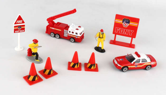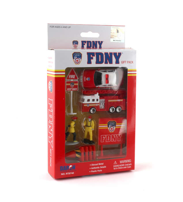 Officially licensed FDNY 10-piece gift pack includes car, fire engine with ladder, two signs, cones, and two figures. Die-cast metal. Authentic detail. Plastic parts. Ages 3+