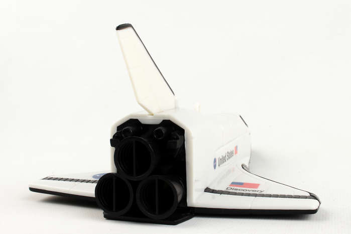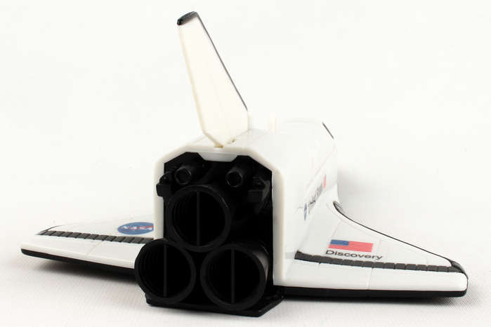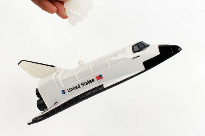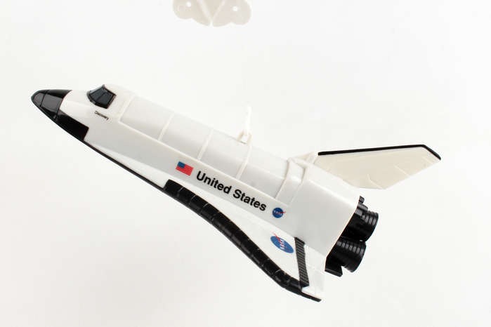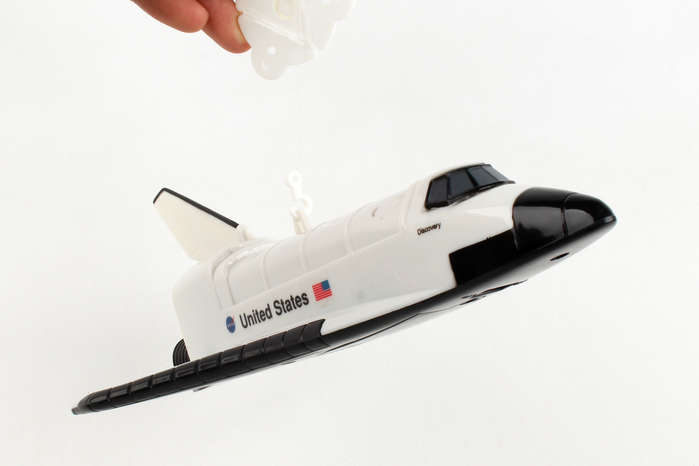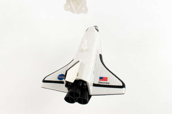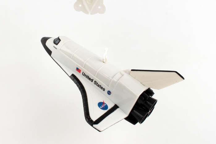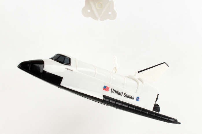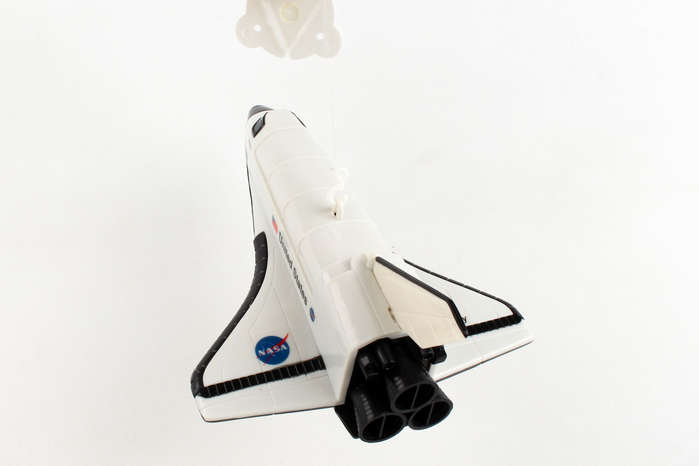 Orbiting Space Shuttle. Swiveling apparatus hooks to any ceiling and enables the aircraft to navigate itself in a 360 degree circle. 2 AA batteries not included.