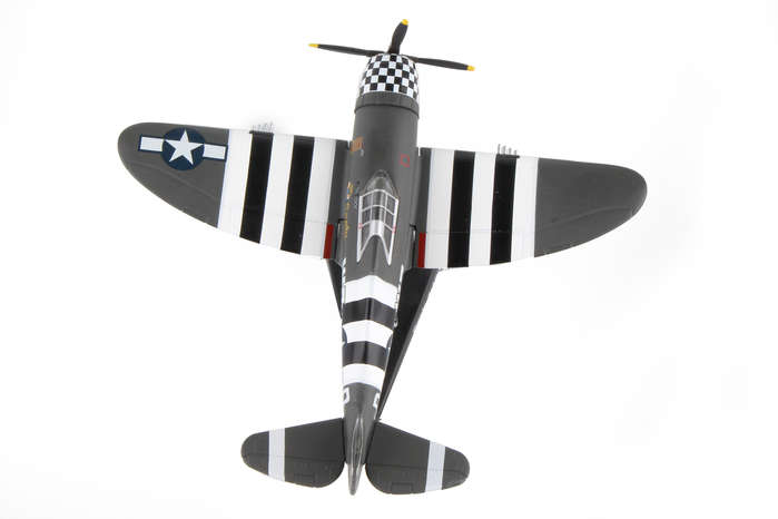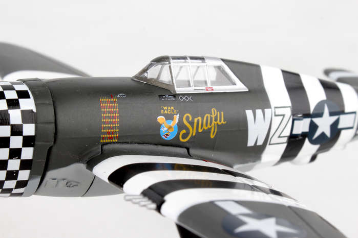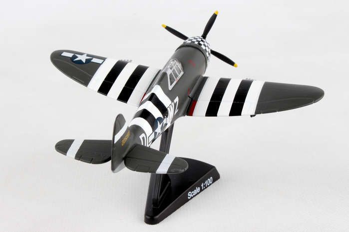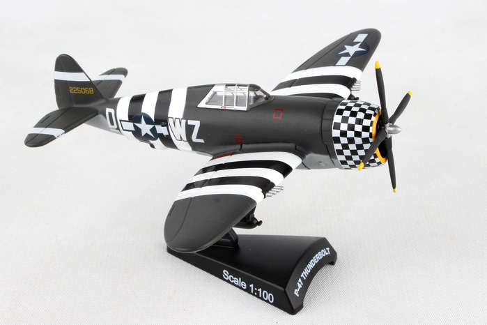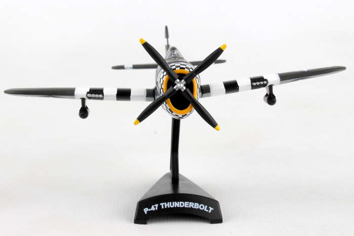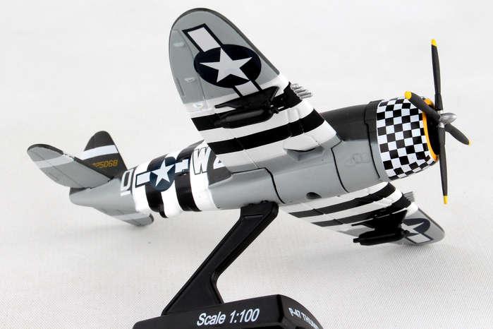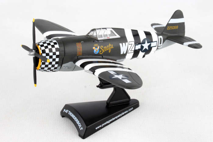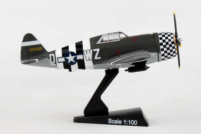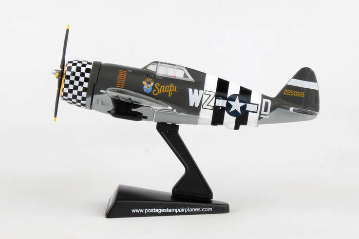 This Die-cast metal airplane model comes in 1:100 scale with plastic stand and is approximately 4 1/4 inches long with 4 3/4 inch wingspan. The P-47 Thunderbolt was a fighter-bomber used by the United States Army Air Forces during World War II. Over 15,000 planes were built during its operational lifetime. With the aid of drop tanks (auxiliary fuel tanks), the P-47 could cover long distances and was feared because of its eight .50 caliber guns. The P-47 was the heaviest single engine WWII fighter and the first piston powered fighter to exceed 500 mph. This P-47 has been painted to represent "Snafu" as flown by the 78th Fighter Group stationed in England in late 1944 to battle enemy Luftwaffe fighters and provide escort to Allied heavy bombers. It has been restored to its wartime condition by The Fighter Collection, a private operator of airworthy vintage military aircraft based at historic Duxford Airfield in Cambridgeshire, UK. Adult Collectible ages 14+