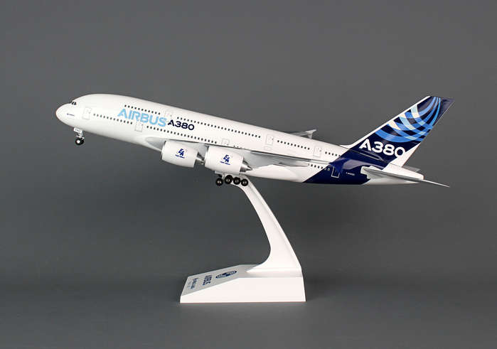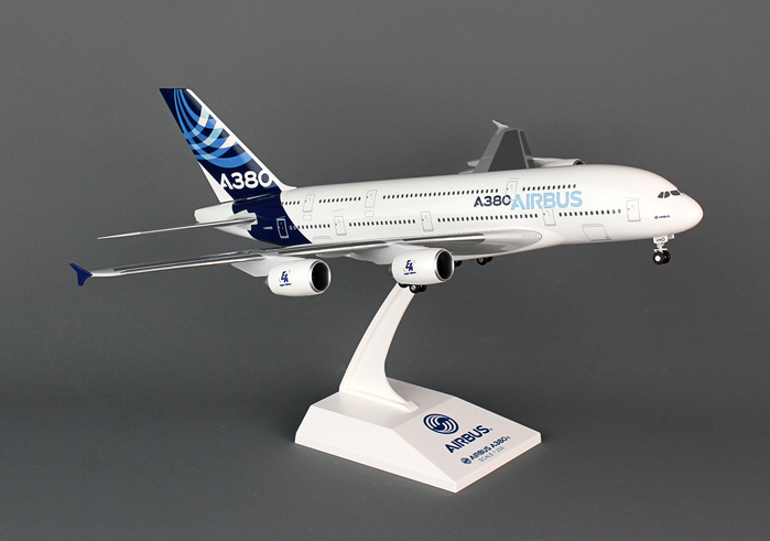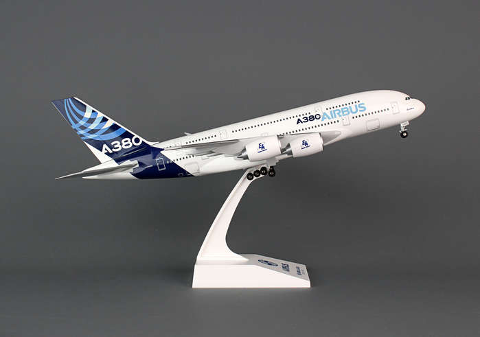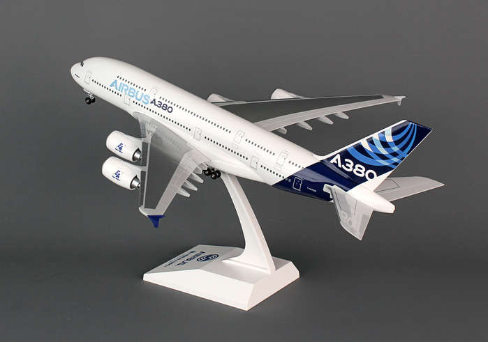 Here it is!! The next generation of wide bodies......The Airbus A380-800 Double-Deck airliner! This incredible model represents the prototype of the largest airliner yet. This true to scale model features solid injection molded plastic construction with highly detailed graphics. Great for collectors with authentic markings and designs. The snap-fit design allows for easy assembly. All models include a display stand. This model features solid injection molded plastic construction with highly detailed graphics. All models assemble in minutes and include a display stand. 14" long x 15 5/8" wingspan.