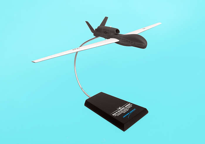 The Northrop Grumman RQ-4 Global Hawk is an unmanned aerial vehicle (UAV) used as a surveillance aircraft. It can survey as much as 100,000 square kilometers of terrain a day, able to provide high resolution Synthetic Aperture Radar (SAR) that can penetrate cloud-cover and sandstorms, and Electro-Optical/Infrared (EO/IR) imagery at long range with loiter times over target areas. This high quality replica is handcrafted from resin and comes with a wooden base. Length is 7.125" and wingspan is 20.5".